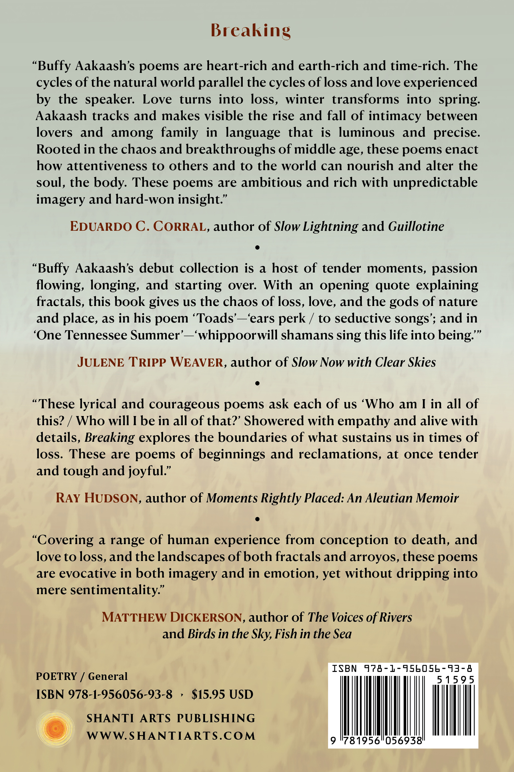 “Buffy Aakaash’s poems are heart-rich and earth-rich and time-rich. The cycles of the natural world parallel the cycles of loss and love experienced by the speaker. Love turns into loss, winter transforms into spring. Aakaash tracks and makes visible the rise and fall of intimacy between lovers and among family in language that is luminous and precise. Rooted in the chaos and breakthroughs of middle age, these poems enact how attentiveness to others and to the world can nourish and alter the soul, the body. These poems are ambitious and rich with unpredictable imagery and hard-won insight.” “Buffy Aakaash’s debut collection is a host of tender moments, passion flowing, longing, and starting over. With an opening quote explaining fractals, this book gives us the chaos of loss, love, and the gods of nature and place, as in his poem ‘Toads’—‘ears perk / to seductive songs’; and in ‘One Tennessee Summer’—‘whippoorwill shamans sing this life into being.’” “These lyrical and courageous poems ask each of us ‘Who am I in all of this? / Who will I be in all of that?’ Showered with empathy and alive with details, Breaking explores the boundaries of what sustains us in times of loss. These are poems of beginnings and reclamations, at once tender and tough and joyful.” “Covering a range of human experience from conception to death, and love to loss, and the landscapes of both fractals and arroyos, these poems are evocative in both imagery and in emotion, yet without dripping into mere sentimentality.” —Matthew Dickerson, author of The Voices of Rivers and Birds in the Sky, Fish in the Sea |