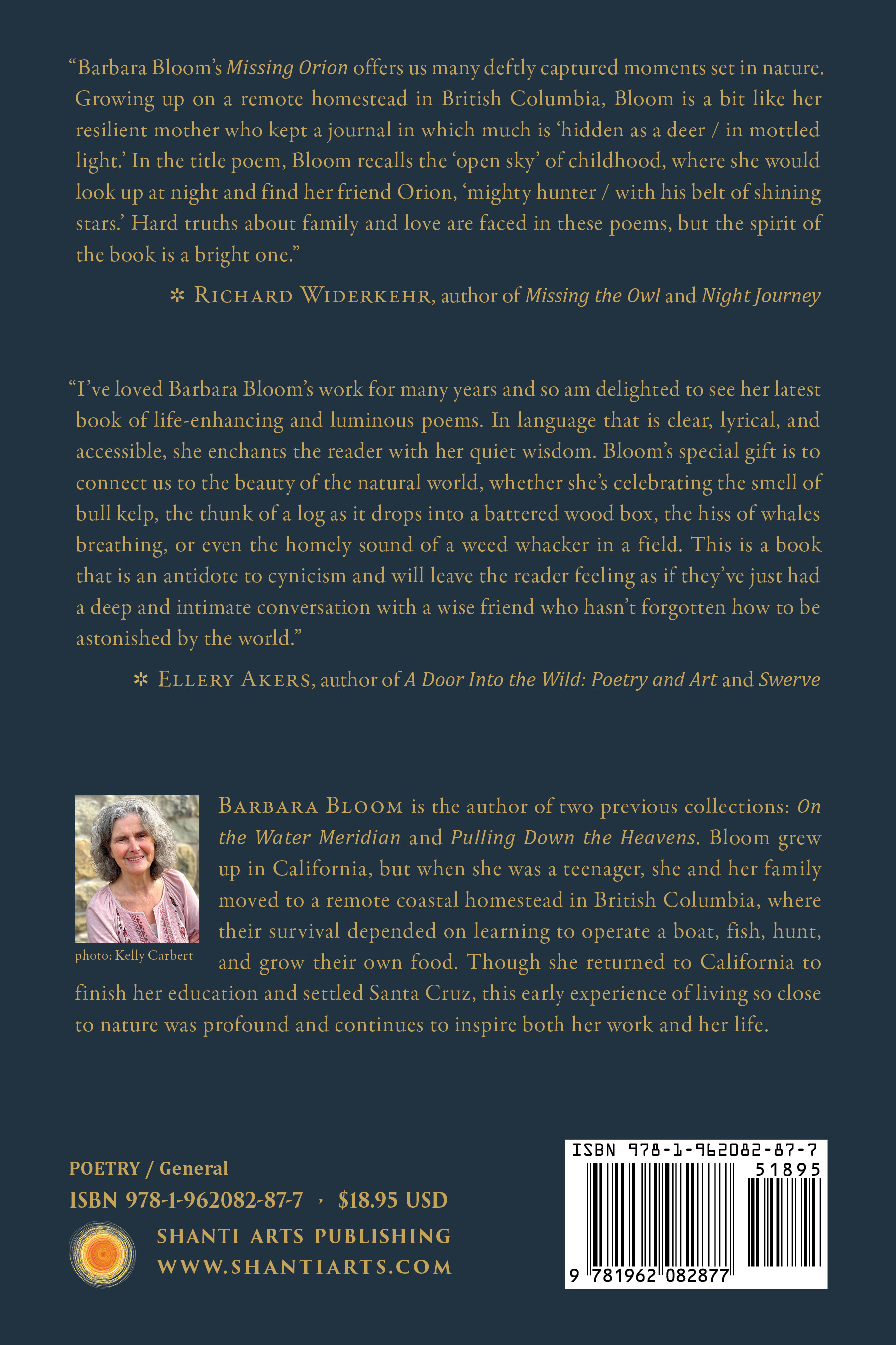 “Barbara Bloom’s Missing Orion offers us many deftly-captured moments set in nature. Growing up on a remote homestead in British Columbia, Bloom is a bit like her resilient mother who kept a journal in which much is ‘hidden as a deer / in mottled light.’ In the title poem, Bloom recalls the ‘open sky’ of childhood, where she would look up at night and find her friend Orion, ‘mighty hunter / with his belt of shining stars.’ Hard truths about family and love are faced in these poems, but the spirit of the book is a bright one.” “I’ve loved Barbara Bloom’s work for many years and so am delighted to see her latest book of life-enhancing and luminous poems. In language that is clear, lyrical, and accessible, she enchants the reader with her quiet wisdom. Bloom’s special gift is to connect us to the beauty of the natural world, whether she’s celebrating the smell of bull kelp, the thunk of a log as it drops into a battered wood box, the hiss of whales breathing, or even the homely sound of a weed whacker in a field. This is a book that is an antidote to cynicism and will leave the reader feeling as if they’ve just had a deep and intimate conversation with a wise friend who hasn’t forgotten how to be astonished by the world.” |