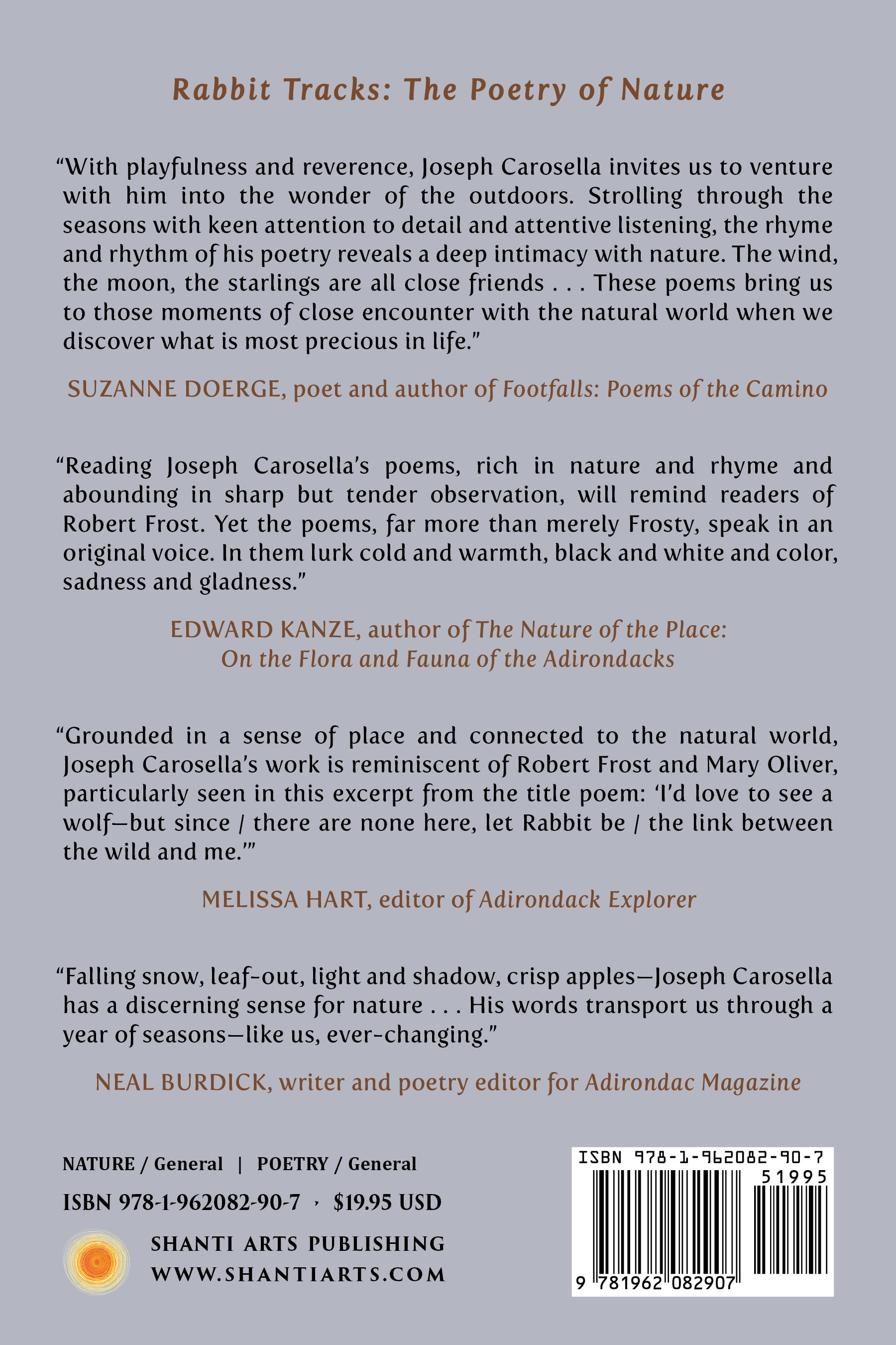 “With playfulness and reverence, Joseph Carosella invites us to venture with him into the wonder of the outdoors. Strolling through the seasons with keen attention to detail and attentive listening, the rhyme and rhythm of his poetry reveals a deep intimacy with nature. The wind, the moon, the starlings are all close friends. Whether expressing humility before the wisdom of clouds or close observation of an inchworm, we are encouraged to slow down and reclaim our connection to the natural world so that we too can be ‘flushed, enthused, restored.’ These poems bring us to those moments of close encounter with the natural world when we discover what is most precious in life.” "Reading Joseph Carosella's poems, rich in nature and rhyme and abounding in sharp but tender observation, will remind readers of Robert Frost. Yet the poems, far more than merely Frosty, speak in an original voice. In them lurk cold and warmth, black and white and color, sadness and gladness.” “This collection of observations takes the reader through a year in the northern forest. Grounded in a sense of place and connected to the natural world, Joseph Carosella's work is reminiscent of Robert Frost and Mary Oliver, particularly seen in this excerpt from the title poem: ‘I'd love to see a wolf—but since / there are none here, let Rabbit be / the link between the wild and me.’” “Falling snow, leaf-out, light and shadow, crisp apples—Joseph Carosella has a discerning sense for nature. Beyond that, though, he binds together the physical and the human: ‘We’ll coexist,’ he reminds us. His words transport us through a year of seasons—like us, ever-changing. Like the rabbit in his title piece, his poems hop attentively from place to place, seeking ‘the link between the wild and me.’ Read these poems, and you will seek the link between the wild and yourself.” |