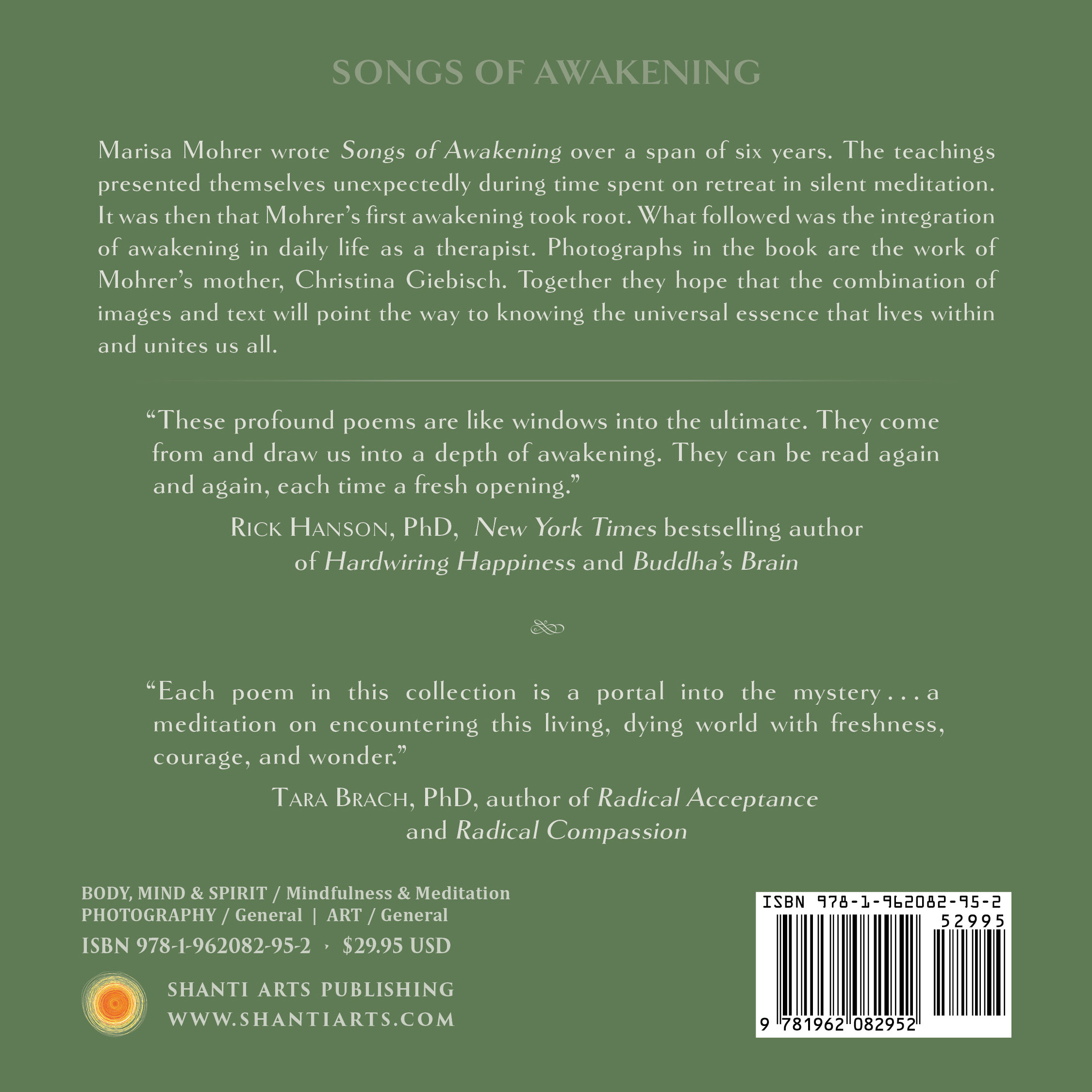 “Marisa Mohrer stunningly transmits aspects of the Mystery with each poem, speaking from what she knows in the depth of her Being. These pointers move the heart deeply, encouraging transcendence of the everyday mind and evoking contact with our deeper nature. Her ‘songs of awakening’ carry on an ancient tradition, helping modern seekers touch the freedom of realization.” “Each poem in this collection is a portal into the mystery . . . a meditation on encountering this living, dying world with freshness, courage, and wonder.” “Songs of Awakening fulfills the promise of the title. This wonderful collection of poems points to the experience of awakening with such grace and simplicity that it opens the way to our own deepening realization.” “These profound poems are like windows into the ultimate. They come from and draw us into a depth of awakening. They can be read again and again, each time a fresh opening.” “In Songs of Awakening, Marisa Mohrer shares her heart through this collection of lovely poems. Poems to be read, re-read, and savored, a pleasure to read and contemplate as we move deeper into listening to our hearts and minds.” “Marisa Mohrer reveals her first awakening to us through her beautiful words. Each poem points the reader toward that mystery tucked deeply in our consciousness—the source of all, the Absolute. Journey with Mohrer as she touches into and reveals her direct experience of awakening.” |