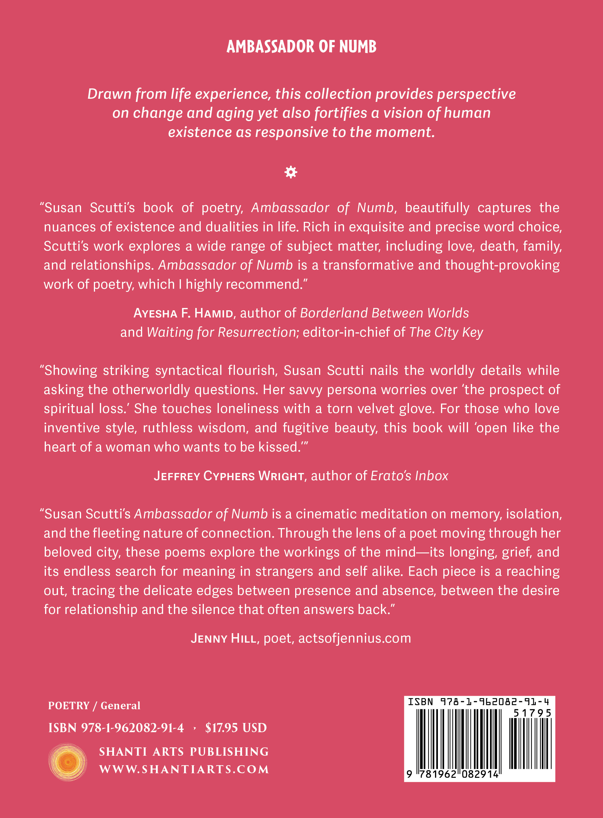 “Susan Scutti’s book of poetry, Ambassador of Numb, beautifully captures the nuances of existence and dualities in life. Rich in exquisite and precise word choice, Scutti’s work explores a wide range of subject matter, including love, death, family, and relationships. Ambassador of Numb is a transformative and thought-provoking work of poetry, which I highly recommend.” “Showing striking syntactical flourish, Susan Scutti nails the worldly details while asking the otherworldly questions. Her savvy persona worries over ‘the prospect of spiritual loss.’ She touches loneliness with a torn velvet glove. For those who love inventive style, ruthless wisdom, and fugitive beauty, this book will ‘open like the heart of a woman who wants to be kissed.’” “Susan Scutti's Ambassador of Numb is a cinematic meditation on memory, isolation, and the fleeting nature of connection. Through the lens of a poet moving through her beloved city, these poems explore the workings of the mind—its longing, grief, and its endless search for meaning in strangers and self alike. Each piece is a reaching out, tracing the delicate edges between presence and absence, between the desire for relationship and the silence that often answers back.” |