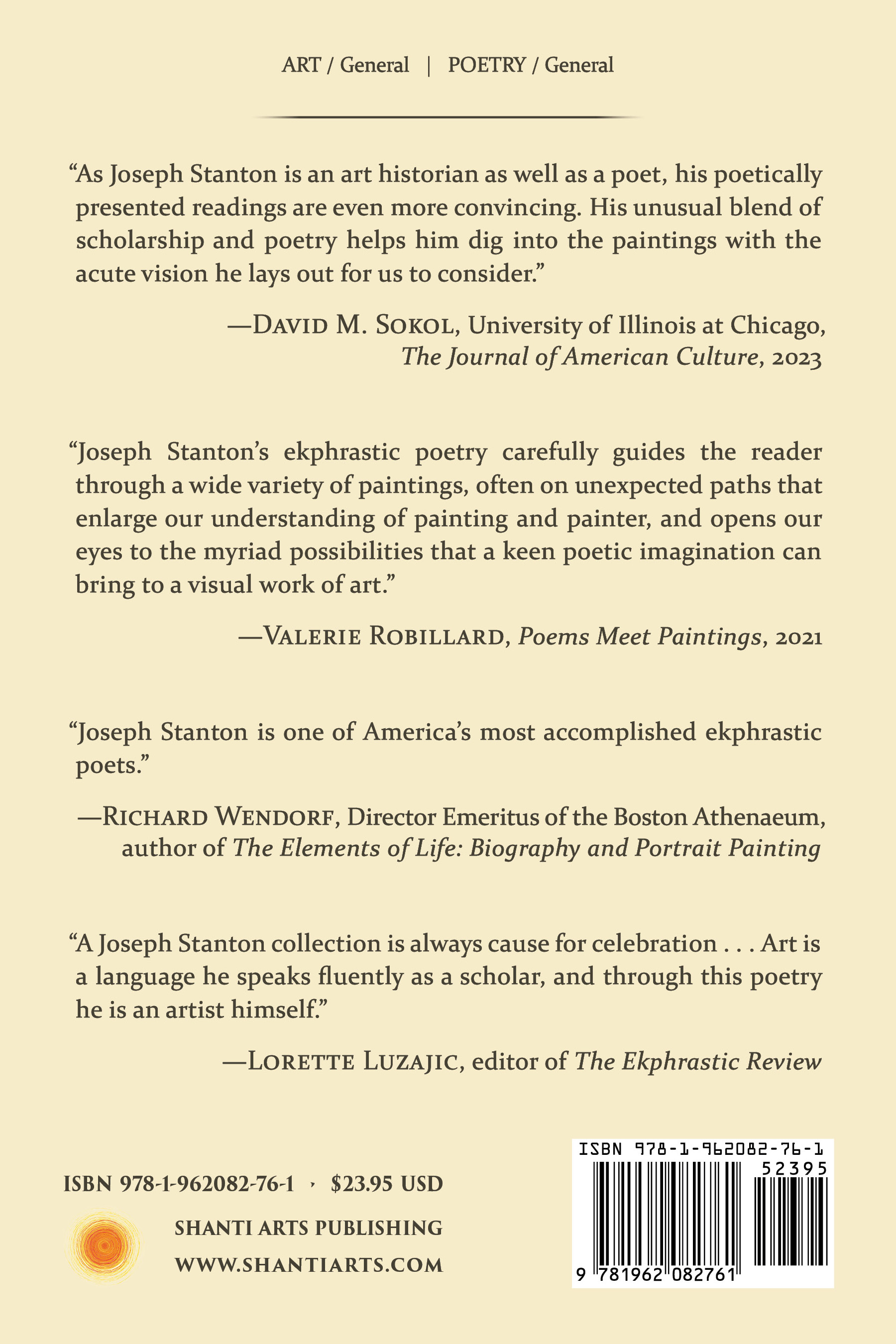 “Joseph Stanton is one of America’s most accomplished ekphrastic poets.” “A Joseph Stanton collection is always cause for celebration . . . Art is a language he speaks fluently as a scholar, and through this poetry he is an artist himself.” “Joseph Stanton’s ekphrastic poetry carefully guides the reader through a wide variety of paintings, often on unexpected paths that enlarge our understanding of painting and painter, and opens our eyes to the myriad possibilities that a keen poetic imagination can bring to a visual work of art.” “As Joseph Stanton is an art historian as well as a poet, his poetically presented readings are even more convincing. His unusual blend of scholarship and poetry helps him dig into the paintings with the acute vision he lays out for us to consider.” |