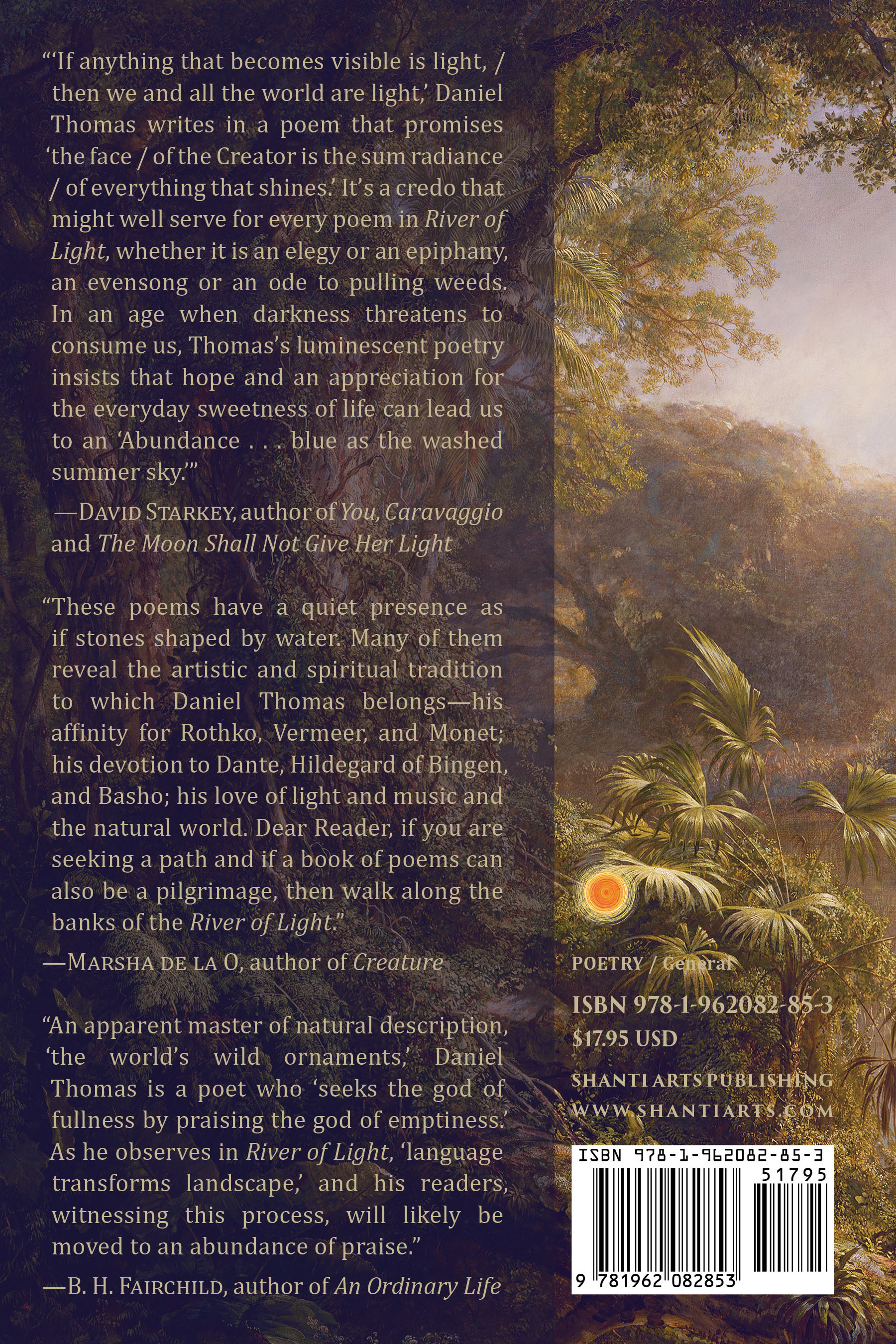“‘If anything that becomes visible is light, / then we and all the world are light,’ Daniel Thomas writes in a poem that promises ‘the face / of the Creator is the sum radiance / of everything that shines.’ It’s a credo that might well serve for every poem in River of Light, whether it is an elegy or an epiphany, an evensong or an ode to pulling weeds. In an age when darkness threatens to consume us, Thomas’s luminescent poetry insists that hope and an appreciation for the everyday sweetness of life can lead us to an ‘Abundance . . . blue as the washed summer sky’.” “These poems have a quiet presence as if stones shaped by water. Many of them reveal the artistic and spiritual tradition to which Daniel Thomas belongs—his affinity for Rothko, Vermeer, and Monet; his devotion to Dante, Hildegard of Bingen, and Basho; his love of light and music and the natural world. Dear Reader, if you are seeking a path and if a book of poems can also be a pilgrimage, then walk along the banks of the River of Light.” “An apparent master of natural description, ‘the world’s wild ornaments,’ Daniel Thomas is a poet who ‘seeks the god of fullness by praising the god of emptiness.’ As he observes in River of Light, ‘language transforms landscape,’ and his readers, witnessing this process, will likely be moved to an abundance of praise.” |