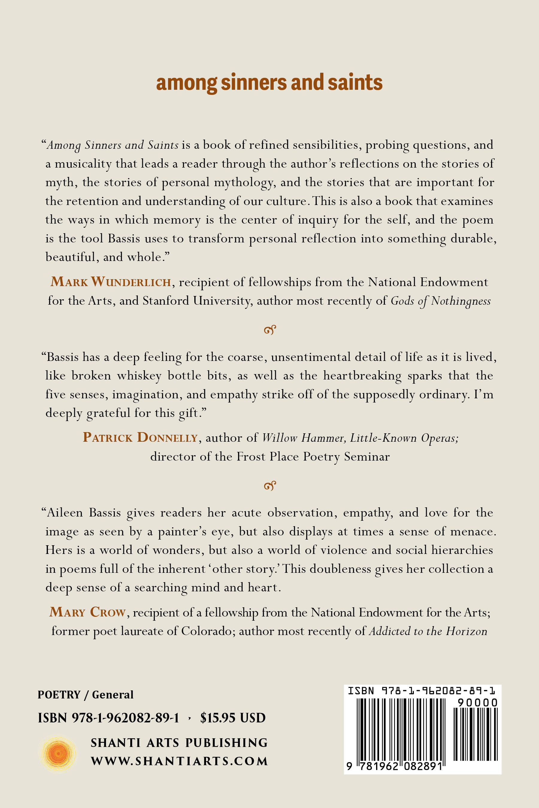 Among Sinners and Saints To pay by check please use this order form. We are pleased to take orders from retailers. Email us with details about your order or call us at 207-837-5760. Aileen Bassis’s poetry collection, Among Sinners and Saints, builds on her lifelong practice as a visual artist. Bassis draws the reader to share her humane and empathic gaze through evocative language and striking imagery. Her poems explore a multitude of connections—from Greek mythology to French cinema, the pain and joy of love and marriage, to the ever present realities of grief and hope. She raises questions for us all and seeks to find meaning in our shared humanity in this, our fraught and divided time. POETRY / General ISBN: 978-1-962082-89-1 (print; softcover; perfect bound) Released January 13, 2026 | Copyright 2026 70 pages |
