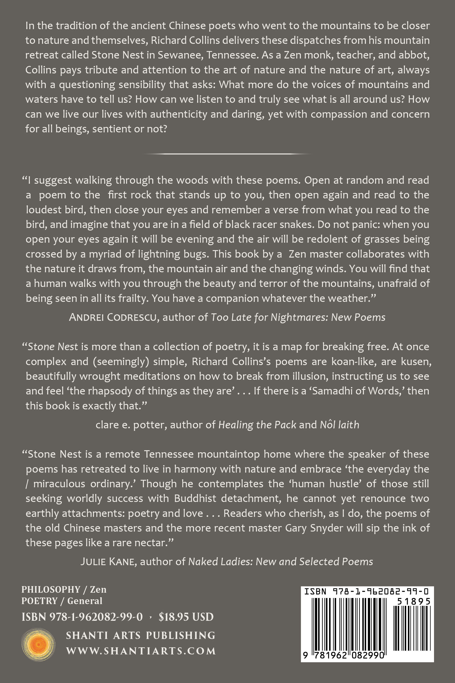“I suggest walking through the woods with these poems. Open at random and read a poem to the first rock that stands up to you, then open again and read to the loudest bird, then close your eyes and remember a verse from what you read to the bird, and imagine that you are in a field of black racers snakes. Do not panic: when you open your eyes again it will be evening and the air will be redolent of grasses being crossed by a myriad of lightning bugs. This book by a Zen master collaborates with the nature it draws from, the mountain air and the changing winds. You will find that a human walks with you through the beauty and terror of the mountains, unafraid of being seen in all its frailty. You have a companion whatever the weather.” “Stone Nest is more than a collection of poetry, it is a map for breaking free. At once complex and (seemingly) simple, Richard Collins’s poems are koan-like, are kusen, beautifully wrought meditations on how to break from illusion, instructing us to see and feel ‘the rhapsody of things as they are.’ This book is a field of consciousness where energy transfers from one poem to the next, and then back, and on again. It opens with a ‘shoreless river’ making its way through terrain of deep spiritual seeking, connecting, disconnecting, arriving at cicadas leaving their forms, and the ultimate ‘silent emptiness.’ This is profound and compelling work. The attention to form, image, language, space eases the reader into a meditative state, to ‘embrace the miraculous ordinary.’ If there is a ‘Samadhi of Words,’ then this book is exactly that.” “Stone Nest is a remote Tennessee mountaintop home where the speaker of these poems has retreated to live in harmony with nature and embrace ‘the everyday the / miraculous ordinary.’ Though he contemplates the ‘human hustle’ of those still seeking worldly success with Buddhist detachment, he cannot yet renounce two earthly attachments: poetry and love. The poems about his daughter stand out as especially beautiful and moving. Readers who cherish, as I do, the poems of the old Chinese masters and the more recent master Gary Snyder will sip the ink of these pages like a rare nectar.” |