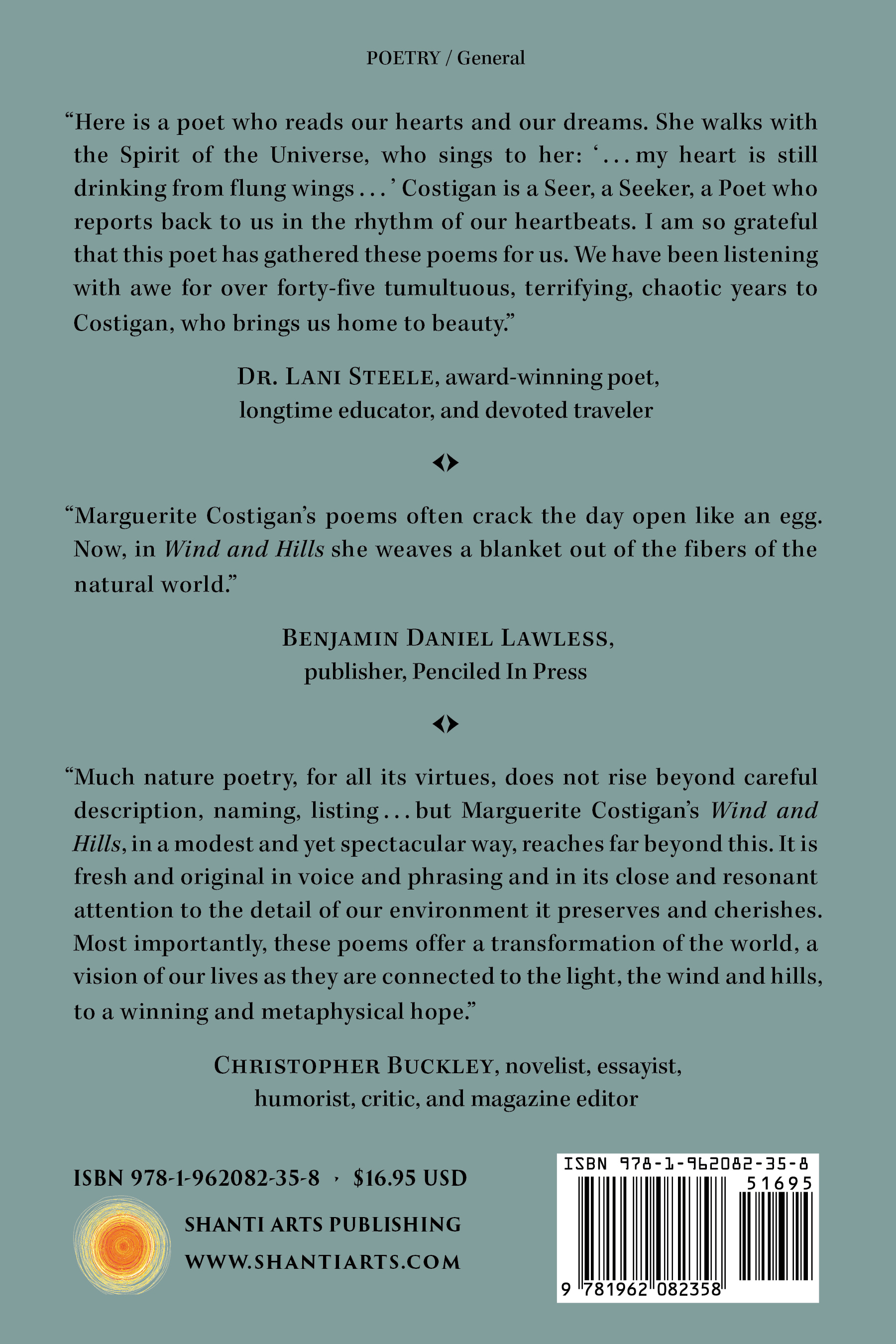 “Here is a poet who reads our hearts and our dreams. She walks with the Spirit of the Universe, who sings to her: ‘ . . . my heart is still drinking from flung wings . . . ’ Costigan is a Seer, a Seeker, a Poet who reports back to us in the rhythm of our heartbeats. I am so grateful that this poet has gathered these poems for us. We have been listening with awe for over forty-five tumultuous, terrifying, chaotic years to Costigan, who brings us home to beauty.” “Marguerite Costigan's poems often crack the day open like an egg. Now, in Wind and Hills she weaves a blanket out of the fibers of the natural world.” “Much nature poetry, for all its virtues, does not rise beyond careful description, naming, listing . . . but Marguerite Costigan’s Wind and Hills, in a modest and yet spectacular way, reaches far beyond this. It is fresh and original in voice and phrasing and in its close and resonant attention to the detail of our environment it preserves and cherishes. Most importantly, these poems offer a transformation of the world, a vision of our lives as they are connected to the light, the wind and hills, to a winning and metaphysical hope.” “Artist-poet Marguerite Costigan is a long-lived dweller on and in land once Northern Chumash and miles north Salinan. Wide open she is to our environment, other scapes, nonhuman residents, and shapemakers. Porous her skin and aura for the beauty of landscape to cascade inwardly. The experience swells as an anxious, overwhelming ache of wondrous beauty barely tolerable. In these moments that what absorbed returns through her porous words, words leaking back from what received into the reader. Should the reader be open, be in union, the shared beauty becomes a tidal experience of overwhelming waves caused by a rare, deep knowing. From any of these wave building poems a droplet may be seen as a line in a poem, minimal like haiku. The variety of droplet lines, couplets, and stanzas to be held to the gem-piercing sun are formed by the seeing of her painter eye and the hearing of her poet ear, the poetry in her poetry. These poems record a dive into landscape and inhabitants out of which, from inside out, sing and chant messages heard from the elements, nonhumans, and their spirit guides. I can say without blushing or hyperbole, Costigan is a poetry daughter of the Pole Star of Big Sur poetry to our north, Robertson Jeffers. I also claim she does a deeper dive. Among Indigenous North American ways there is a phrase: ‘When in Beauty beautiful things happen.’ After holding and reading this collection the poems remain resonating in the mind and if open enough in the body cells calling forth protective action in this moment of ours.” |
