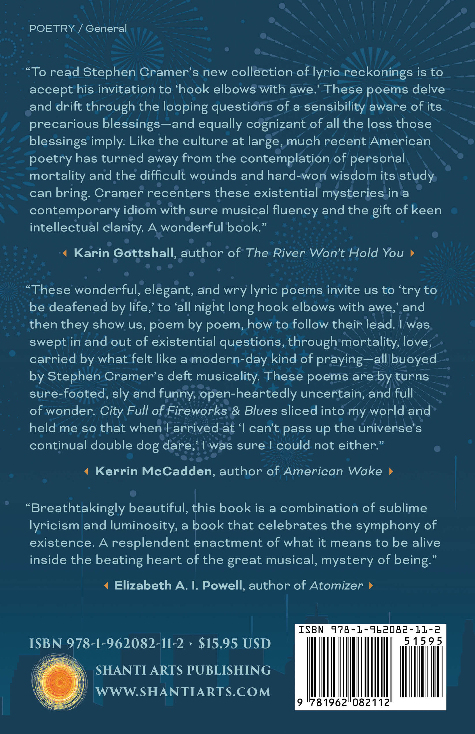 “To read Stephen Cramer’s new collection of lyric reckonings is to accept his invitation to ‘hook elbows with awe.’ These poems delve and drift through the looping questions of a sensibility aware of its precarious blessings—and equally cognizant of all the loss those blessings imply. Like the culture at large, much recent American poetry has turned away from the contemplation of personal mortality and the difficult wounds and hard-won wisdom its study can bring. Cramer recenters these existential mysteries in a contemporary idiom with sure musical fluency and the gift of keen intellectual clarity. A wonderful book.” “These wonderful, elegant, and wry lyric poems invite us to ‘try to be deafened by life,’ to ‘all night long hook elbows with awe,’ and then they show us, poem by poem, how to follow their lead. I was swept in and out of existential questions, through mortality, love, carried by what felt like a modern-day kind of praying—all buoyed by Stephen Cramer’s deft musicality. These poems are by turns sure-footed, sly and funny, open-heartedly uncertain, and full of wonder. City Full of Fireworks & Blues sliced into my world and held me so that when I arrived at ‘I can’t pass up the universe’s continual double dog dare,’ I was sure I could not either.” “Breathtakingly beautiful, this book is a combination of sublime lyricism and luminosity, a book that celebrates the symphony of existence. A resplendent enactment of what it means to be alive inside the beating heart of the great musical, mystery of being.”     | |||||||||||||