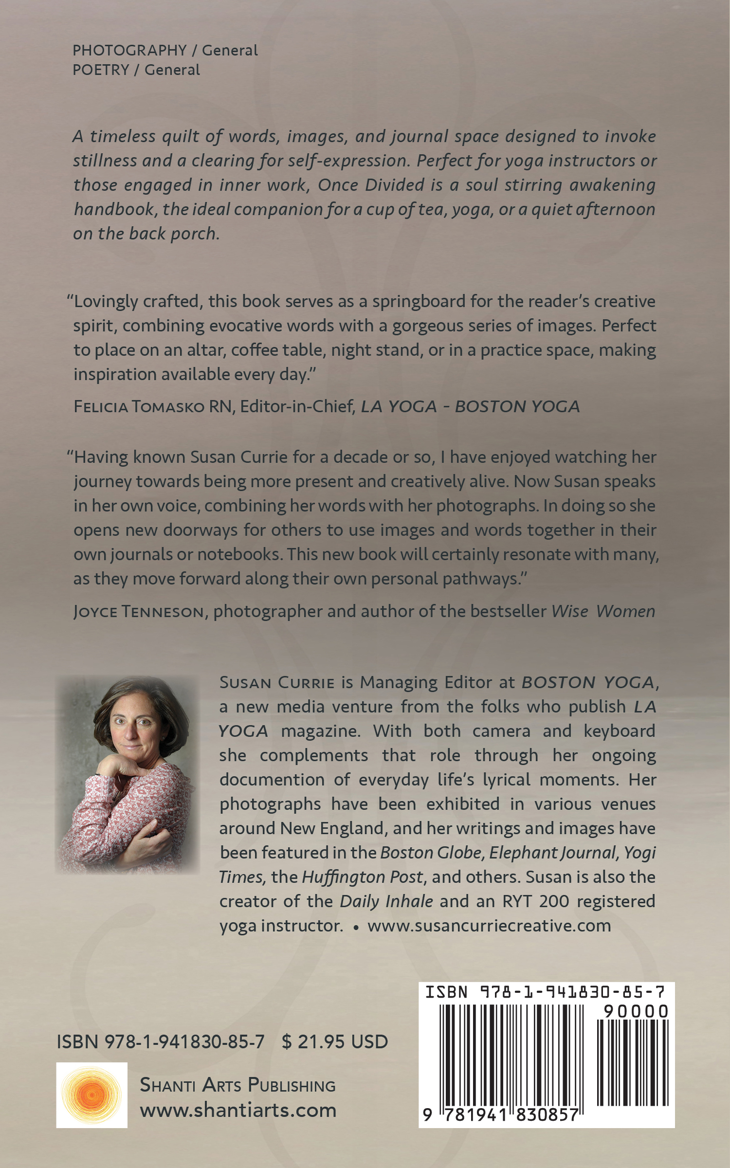 Photographer and yoga instructor Susan Currie has long produced work celebrated for its sacred threads. In this new collection, a seamless blend of visual and verse, she uses rich imagery as prompts for the written word. With grace and simplicity Once Divided shines a soft light on all of the glorious meanwhiles happening amidst the chatter, inviting readers from all walks to pause, gather, and reconnect with their translation of “home." Within its pages Ms. Currie and publisher Shanti Arts have woven together a timeless quilt of words, images, and journal space designed to invoke stillness and a clearing for self-expression. Perfect for yoga instructors or those engaged in inner work, Once Divided is a soul stirring awakening handbook, the ideal companion for a cup of tea, yoga, or a quiet afternoon on the back porch. POETRY / General ISBN: 978-1-941830-85-7 (print; softcover; perfect bound) 100 pages |