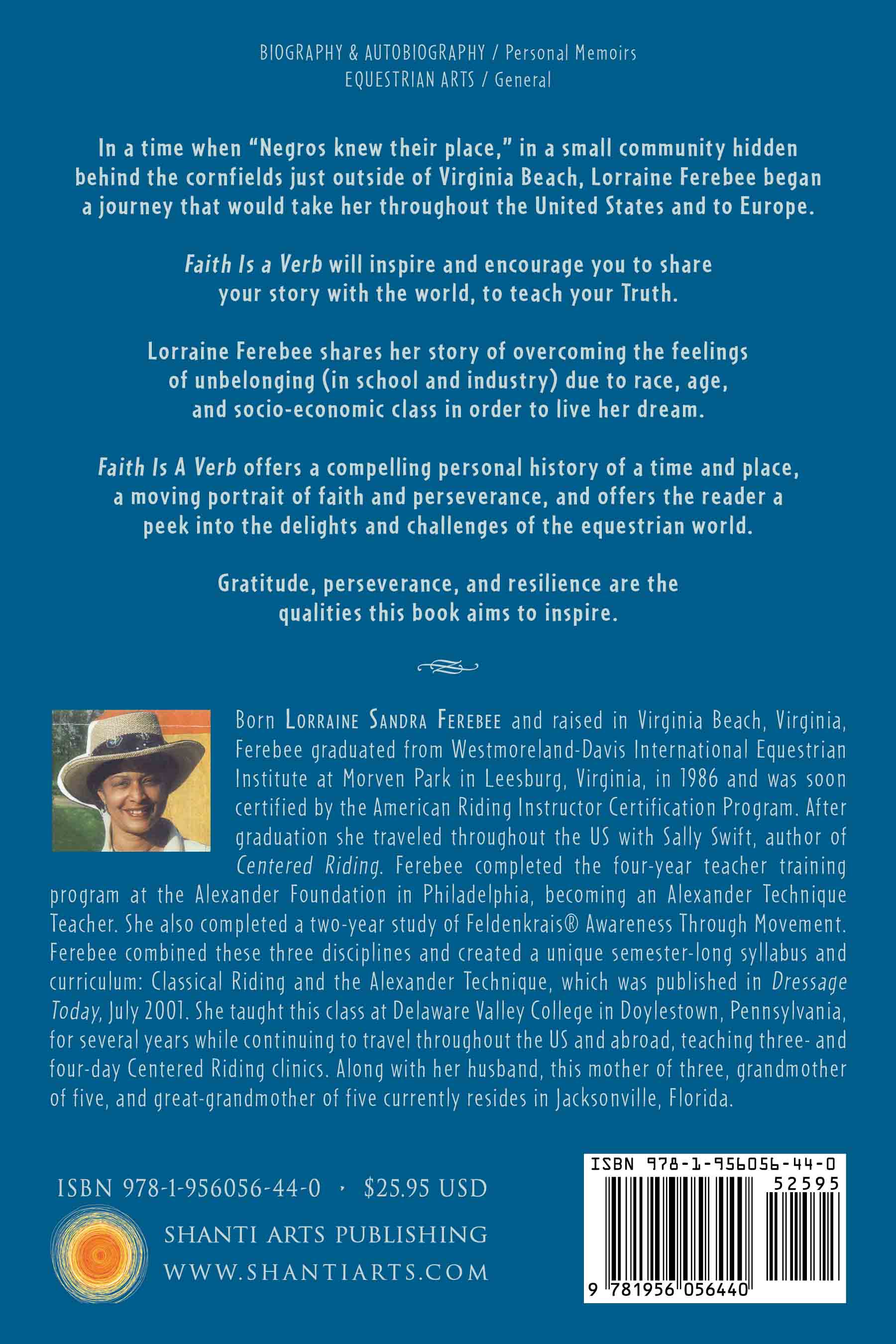 In a time when “Negros knew their place,” in a small community hidden behind the cornfields just outside of Virginia Beach, Lorraine Ferebee began a journey that would take her throughout the United States and to Europe. Faith Is a Verb will inspire and encourage you to share your story with the world, to teach your Truth. Lorraine Ferebee shares her story of overcoming the feelings of unbelonging (in school and industry) due to race, age, and socio-economic class in order to live her dream. Faith Is A Verb offers a compelling personal history of a time and place, a moving portrait of faith and perseverance, and offers the reader a peek into the delights and challenges of the equestrian world. Gratitude, perseverance, and resilience are the qualities this book aims to inspire. |