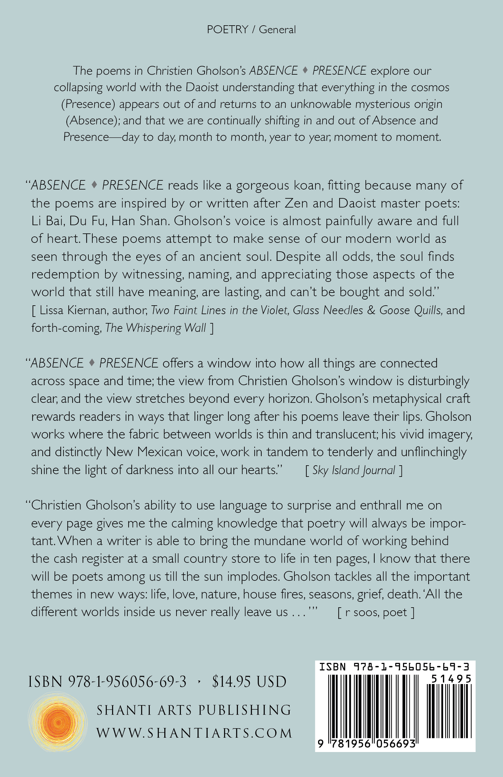 Influenced by T’ang Era Classical poets (including Han Shan, Du Fu, Li Bai, and Wang Wei), the poems in Christien Gholson’s Absence ◆ Presence explore our collapsing world with the Daoist understanding that everything in the cosmos (Presence) appears out of and returns to an unknowable mysterious origin (Absence); and that we are continually shifting in and out of Absence and Presence—day to day, month to month, year to year, moment to moment. Alternatively playful and dark (and sometimes playfully dark), these accessible poems move through the cycle of the seasons, including death, work, dragons, war, coyotes, loss, mass shootings, ghost deer, love, drought, fever dreams and joy, all with a stunned and quiet awe at the beauty hidden everywhere in plain sight. Along the way, we come into contact with a character named No One, resembling the illusive monk-poet Han Shan, seeking answers in the midst of our collapsing civilization, trying to move toward a larger experience of the self, a self that includes community, the natural world, and even the night cosmos, cultivating, like the Classical Chinese poets, a broader and deeper experience of the self. POETRY / General ISBN: 978-1-956056-69-3 (print; softcover; perfect bound) Copyright: 2023; Released 1-17-2023 108 pages |