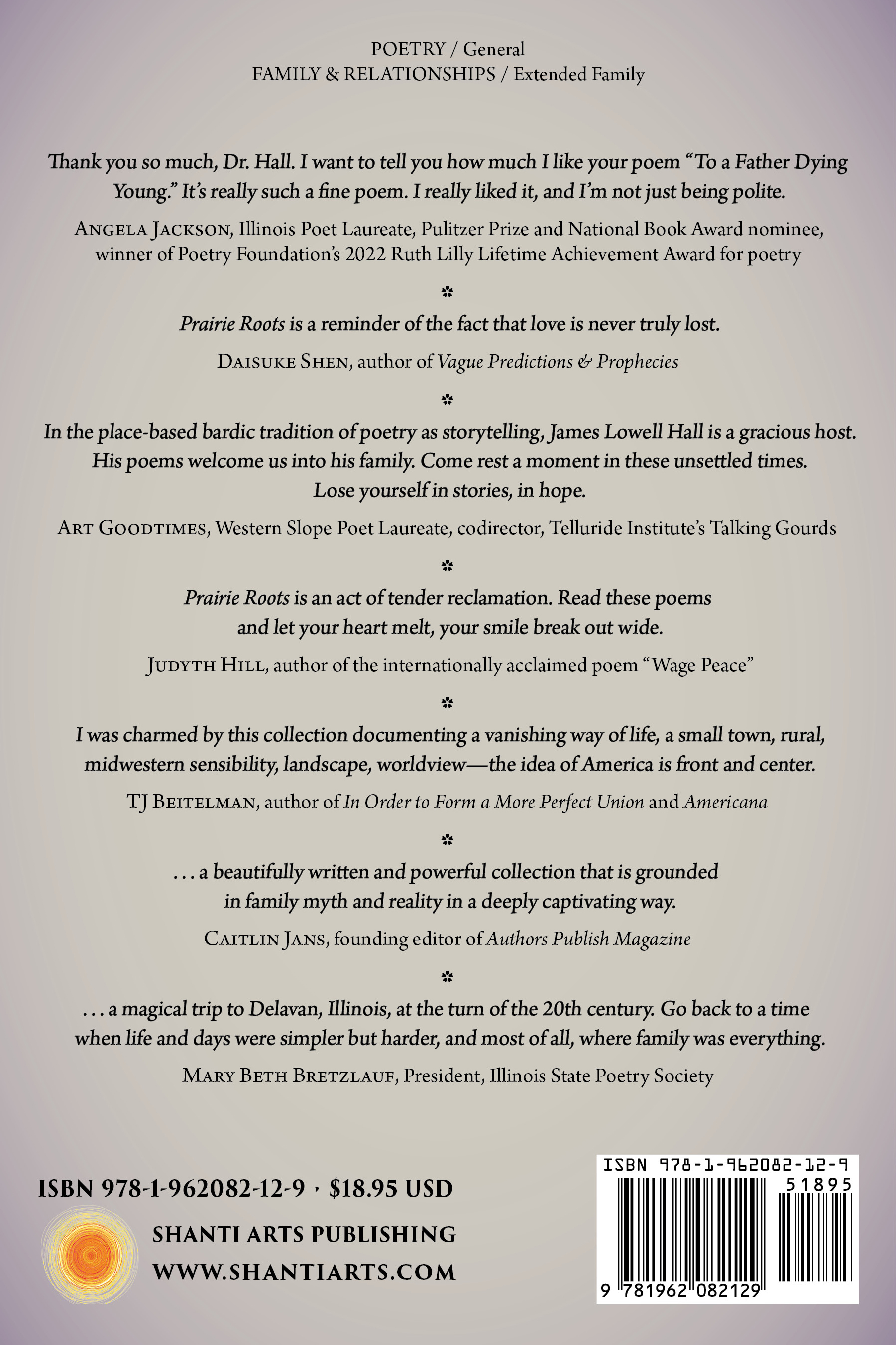 “I was charmed by this collection documenting a vanishing way of life, a small town, rural, midwestern sensibility, landscape, worldview—the idea of America (Americana) is front and center, and narrative elements carry the day. As in any compelling narrative, there are moments that stand out: that first meal of bacon and eggs (which recurs later at the house’s 100th anniversary); that first bag of potato chips; those missing boys on Mother’s Day; poor Wendell nearly drowning in the Mackinaw at the ripe old age of 75. But it’s the voice of these poems—earnest, sincere, joyous, loving—that sustains the collection. That and its depiction of that aforementioned ‘milieu’—a time and place that’s rendered in three-dimensional depth.” “This book of poems is a magical trip to Delavan, Illinois, at the turn of the 20th century. Go back to a time when life and days were simpler but harder, and most of all, where family was everything. Through his poems, James Lowell Hall has cleverly retold stories of several generations—the deep prairie roots of his life. Let’s not forget the colorful townsfolk sprinkled throughout the book. I found myself laughing, sighing, and even wiping a tear as I turned these pages. The sound advice from generations long gone still holds true today. His family photos make it easier for you to imagine your family as a part of this community as well. So unplug for a few hours, curl up, and become a part of charming Delavan. “In the place-based bardic tradition of poetry as storytelling, James Lowell Hall is a gracious host. His poems welcome us into his family. Come rest a moment in these unsettled times. Lose yourself in stories, in hope.” “This book sparks such joy! Such depth of heart and richness of story! Prairie Roots is a celebration of love and family, of long marriage, of country wisdom, the intimacies and deep history of small town life. James Lowell Hall’s collection of poems is a testament to shared memories as our truest treasure can be made exquisitely available to us through the poet’s dedication to craft, nuance, and narrative—and ultimately, and essentially, love. Prairie Roots is an act of tender reclamation. Read these poems and let your heart melt, your smile break out wide.” “Thank you so much, Dr. Hall. And I want to tell you how much I like your poem ‘To a Father Dying Young.’ It's really such a fine poem. I really like it, and I'm not just being polite.” “Prairie Roots is a beautifully written and powerful collection that is grounded in family myth and reality in a deeply captivating way . . . an immersive and engaging collection that very much conveys the strength and nuance of his ancestors.” “Prairie Roots is a vibrant, unforgettable tapestry of time and memory. Hall has carefully preserved all of the artifacts of his Illinois childhood—the smell of cinnamon buns from Plut's Bakery, the mosaic of flowers and flags rippling over Prairie's Rest Cemetery, the gentle snow blanketing Locust Street and covering everything in deep slumber. What can we do but follow along on this journey? Prairie Roots is a reminder of the fact that love is never truly lost.” “In James Lowell Hall’s warm and wonderful collection, Prairie Roots, Hall weaves poems and photos into a grassroots retelling of a family history staked deep in the soil of America’s midwestern prairielands. From the fertile landscape to the members of his family past and present and the faithful telling of the chores and habits that occupied everyone’s daily lives, Hall recreates a world fast disappearing. In ‘Monday Washing Day,’ Hall writes ‘No washers and dryers in those days—we had a scrub board with brass ridges. In the basement sink, we soaked clothes in hot soapy water, our soap homemade from lye, bacon drippings and rainwater.’ In ‘Prairie Sunset,’ Hall writes, ‘West of town at sunset, fields stretch to the far horizon, the last glowing rays of the day shimmer on impossibly straight rows of corn. Tassels burst, haze of golden pollen floating, rising, waiting for the rain.’ Part document, part poetic exploration of the power of the past, Hall’s collection casts a spell over anyone eager to remember.” |
