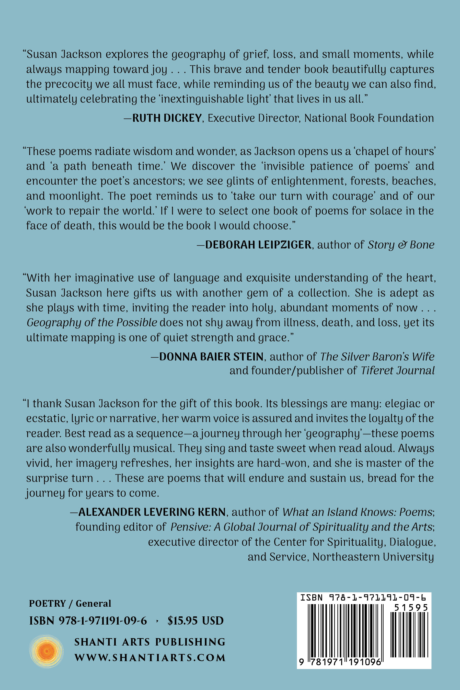 “Susan Jackson’s Geography of the Possible explores the geography of grief, loss, and small moments, while always mapping toward joy, drawing us into being like the fox who ‘comes and goes freely, will take the whole world in her mouth / to chew the juiciness without worrying what drips or spills.’ It’s a book about patience—as Jackson writes, ‘the garden will wait for you forever,’— and about the power of caring through illness, war, death, and all that feels unbearable. Through her attention to detail, Jackson shows us stars ‘poured out of the sky / onto the surface of the water / there and there and there,’ while reminding us of the preciousness of each moment her poems illuminate. She writes, ‘I did not realize how easily all is lost. / Forgive me.’ This brave and tender book beautifully captures the precocity we all must face, while reminding us of the beauty we can also find, ultimately celebrating the ‘inextinguishable light’ that lives in us all.” “In this gorgeous collection, Susan Jackson gives us many gifts: resilience, return, and presence. These poems radiate wisdom and wonder, as Jackson opens us a ‘chapel of hours’ and ‘a path beneath time.’ We discover the ‘invisible patience of poems’ and encounter the poet’s ancestors; we see glints of enlightenment, forests, beaches, and moonlight. The poet reminds us to ‘take our turn with courage’ and of our ‘work to repair the world.’ If I were to select one book of poems for solace in the face of death, this would be the book I would choose.” “With her imaginative use of language and exquisite understanding of the heart, Susan Jackson here gifts us with another gem of a collection. She is adept as she plays with time, inviting the reader into holy, abundant moments of now through such meticulous observations of the curls of carrot skin, eggshells, apple blossoms, perfectly ground coffee beans, five strawberries on a plate. These poems tackle memory and loss, female identity and experience, nature as metaphor for emotion, the passing of time and of love from generation to generation. Nature intrigues this poet, and throughout these pages she shares its bounty of surprise and delight with the reader as owl, fox, fish appear. Both meditative and hopeful, Geography of the Possible does not shy away from illness, death, and loss, yet its ultimate mapping is one of quiet strength and grace.” “Susan Jackson’s newest collection of poems resonates with my heart and mind simultaneously. She makes me into a poet by opening the door to the mystery of her poems and invites me to be in conversation and deep listening with the world. Even in our precarious times Jackson finds pathways through uncertainty. She doesn’t erase the pain of the world. She encourages the reader to find the ‘path beneath time,’ to wonder, to ask existential questions, deepen into the many possibilities in front of us, and to make a whole out of the simple and the shattering. And finally to find the earth beneath our feet where ‘roots sew themselves together’ even for people who have lost their connection to nature. Jackson reminds us that we can count on the earth. We can let questions arise: How can I be a holy woman? What is my solitude like? Who am I after reading these poems? How can I walk through sorrow and be unafraid of death? Ask the fox who meanders through this collection.” “What a joy to discover and savor the luminous poetry of Susan Jackson. In her extraordinary new book, Geography of the Possible, Jackson guides her readers masterfully across vast landscapes—both inward and outward, domestic and global—from her window to her kitchen and garden and the woods beyond; from the Bay of Banderas in Mexico to the ‘solitude of mountains’ in the American West; from Portugal during a coup d’etat to the realms of memory and eternity, where her ancestors (especially women) provide comfort, power, and inspiration. ‘It’s just mapping/infinity really,’ she tells us, and like the wild animals she meets in astonishing moments of ‘I and Thou’ communion, she invites the reader to join her as ‘an explorer in places / beyond the land of understanding.’ Jackson offers her readers powerful and necessary words of encouragement: ‘let me not languish. Let me persevere…hold fast, reach and marvel…let the state of wonder carry me.’ In the darkness, she invites us to breathe in the night air, recalling a ‘dream a woman is telling me / the story of an inextinguishable light that lives inside of everyone.’” |