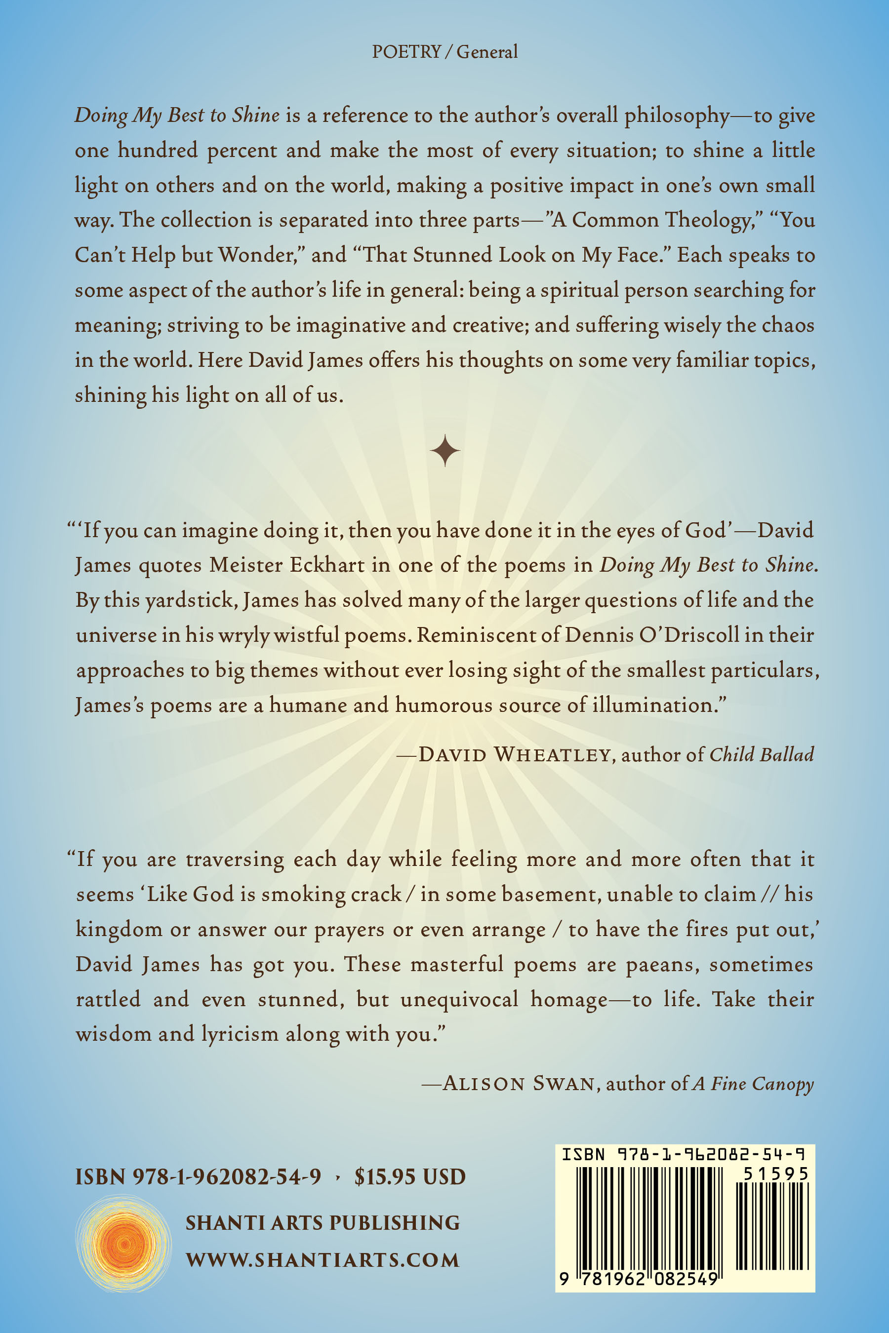 “‘If you can imagine doing it, then you have done it in the eyes of God,’ David James quotes Meister Eckhart in one of the poems in Doing My Best to Shine. By this yardstick, James has solved many of the larger questions of life and the universe in his wryly wistful poems. Reminiscent of Dennis O’Driscoll in their approaches to big themes without ever losing sight of the smallest particulars, James’s poems are a humane and humorous source of illumination.” “If you are traversing each day while feeling more and more often that it seems ‘Like God is smoking crack / in some basement, unable to claim // his kingdom or answer our prayers or even arrange / to have the fires put out,’ David James has got you. These masterful poems are paeans, sometimes rattled and even stunned, but unequivocal homage—to life. Take their wisdom and lyricism along with you.” |
