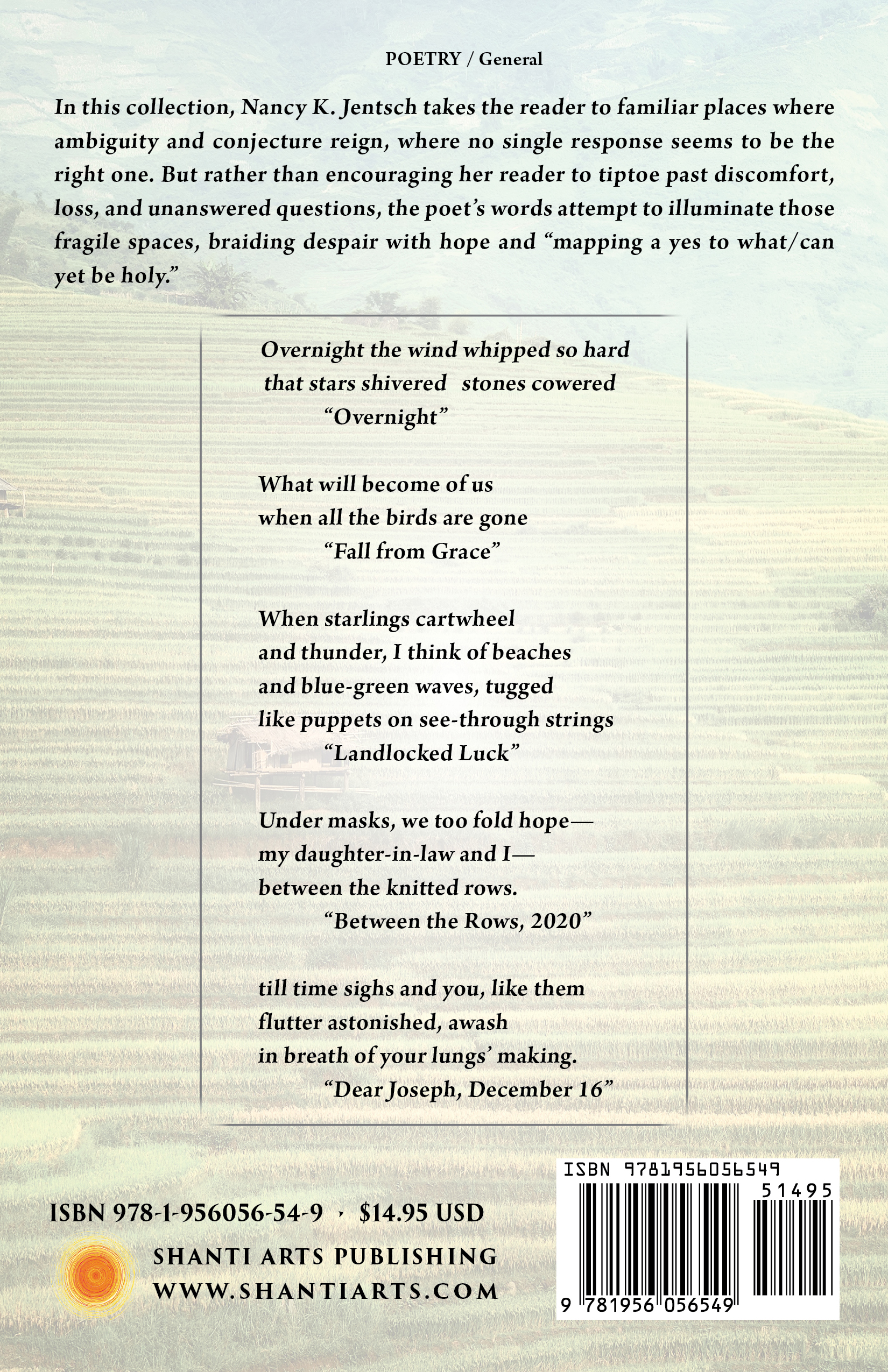 “Nancy K. Jentsch’s new book, Between the Rows, is a beautiful adventure into the spiritual exploration of nature and art. Jentsch masterfully weaves the reader through the unexpected and the uncertain toward the ringing hope of ‘every day has something in it.’ Between the Rows gives us a clear view of the natural world and all its engaging mysteries. Even at a routine bus stop we hear the ‘call of geese / angled to scissor sky.’ The author surprises with phrases like ‘this day slipped from my week’s needle’ and ‘flower beds jeer with weeds.’ These poems will amaze and fill the heart as ‘a cup / that has forgotten / it can hold water.’ “Mixing literature, art, the domestic and the agricultural, Nancy Jentsch expresses her complex life. Between the Rows bring us the work of a teacher of German, traveler, mother, wife, and gardener in poems arising from the everyday but touching the transcendent. In her Kentucky homestead, thinking of visitors to the ocean, she wonders,, ‘Am I lucky living landlocked / by bluegrass and limestone / pinning a second stanza, / blue-green, to the poem the starlings / paint above our hills?’ Yes, we readers gladly answer, for we too are lucky to have this poet’s attention and craft, her celebration of her world and life, and her understated but inescapable apprehension about climate change. These are poems of and for our times.” “Don’t let the spare look of these poems fool you; there is plenty of meat on their bones. Nancy K. Jentsch’s poems are full of wonder and gratitude, brimming with humanity and exquisite detail. Grief and joy dance side by side and, sometimes, together in the same poem. In ‘Survivors,’ the alliteration of words beginning with the letter f creates a fizzle, like letting the air out, leading to a startling revelation. Beloved family members, long gone, are brought to life with memories rich in detail: Mimmie’s Sammeltassen, Pop-Pop’s slide rule, Nana’s mirror. The natural world—geese and voles, vetch and crabgrass—is equally vivid; a spellbound deer with her ‘whole-note eye,’ ‘doves / flutter like falling leaves,’ a stack of hay offers ‘a whiff of last spring’s / blooms.’ Jentsch’s poems compel you to linger. You won’t be sorry if you do. —Yvonne Zipter, author of Kissing the Long Face of the Greyhound |