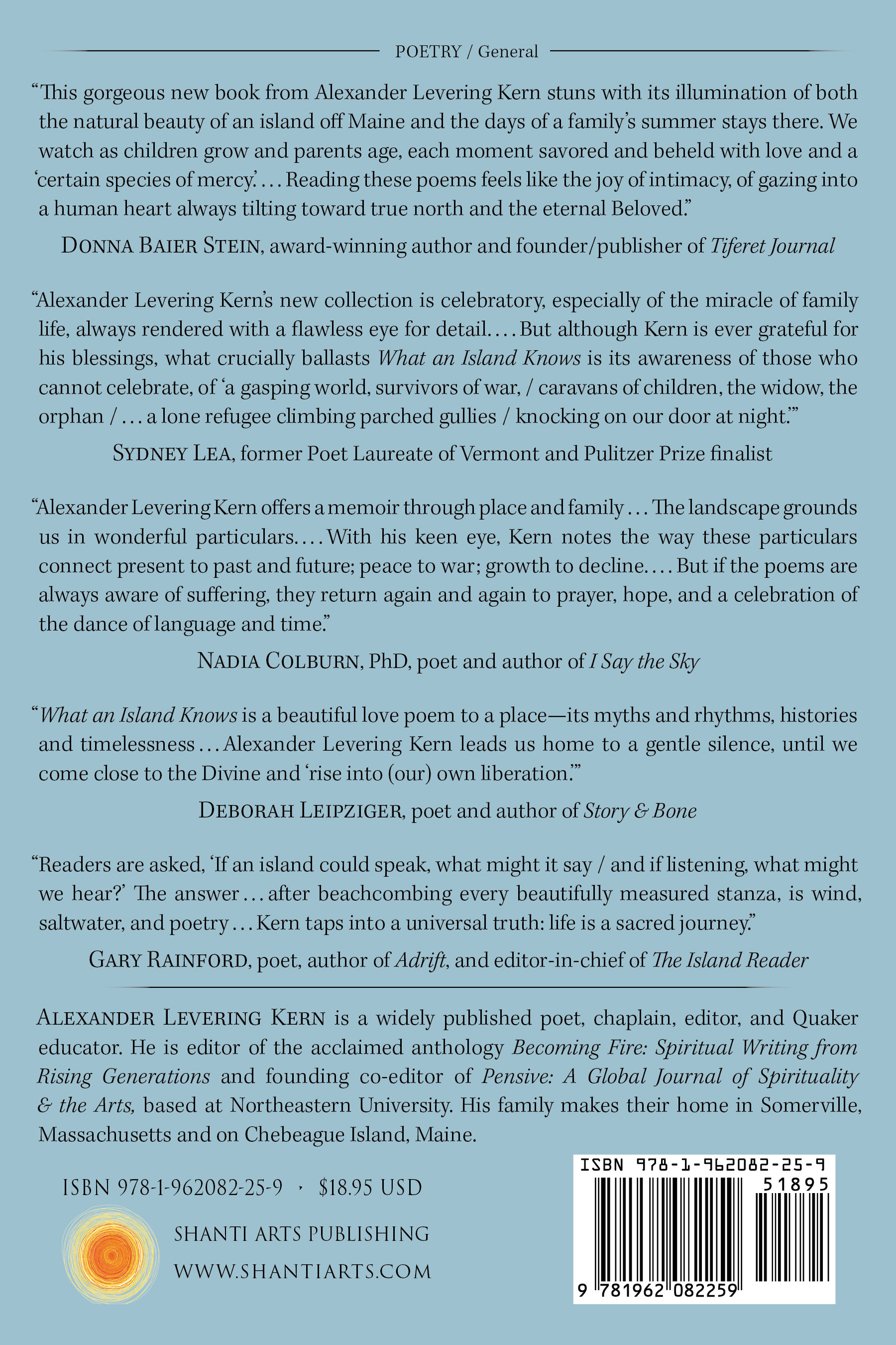 “There is so much to celebrate in Alexander Levering Kern’s new collection! (Because I don’t know where else to say this, so here I’ll urge you to read ‘After Fourteen Years,’ as beautiful an elegy as any you’ll see). The book itself is celebratory, especially of the miracle of family life, always rendered with a flawless eye for detail: back at their summer retreat in coastal Maine, say, he notes ‘the clicking of Legos / on the hardwood floor / as our children create a new world.’ But although Kern is ever grateful for his blessings, what crucially ballasts What an Island Knows is its awareness of those who cannot celebrate, of ‘a gasping world, survivors of war, / caravans of children, the widow, the orphan / . . . a lone refugee climbing parched gullies / knocking on our door at night.’ To me, important poetry always illustrates human maturity. Look at this wonderful collection. In its case, at least, you may well agree.” “This gorgeous new book from Alexander Levering Kern stuns with its illumination of both the natural beauty of an island off Maine and the days of a family’s summer stays there. We watch as children grow and parents age, each moment savored and beheld with love and a ‘certain species of mercy.’ From past wars to present ones, from brand-new parenthood to the hard losses life brings, Kern never fails to ‘gaze into the heart of things.’ Grandparents and earlier days in the Blue Ridge Mountains, the Indigenous peoples who lived on this island, its current-day elders and dogs, church choirs and black-eyed Susans—the poet lets them all speak. Reading these poems feels like the joy of intimacy, of gazing into a human heart always tilting toward true north and the eternal Beloved.” “What an Island Knows is a beautiful love poem to a place—its myths and rhythms, histories and timelessness. Alexander Levering Kern takes us on a pilgrimage to his beloved Chebeague Island in Maine, sharing poem postcards filled with reverence for the ocean, its creatures, and tides. In these poems we encounter luna moths, fireflies, and the music of the Beatles. Here we meet Kern’s Quaker ancestors and honor the footsteps of the Wabanaki people. ‘We are ritual people,’ the poet tells us, all the while inhabiting memory and rituals of belonging and homecoming. This enchanting book fills us with the motion of the tides, the birth of children, and the insistent call of summer. The ‘ocean of memory’ is at once filled with song and the memory of those departed. The poet inhabits his love of the world yet is conscious of its dangers and damage. Kern leads us home to a gentle silence, until we come close to the Divine and ‘rise into (our) own liberation.’” “In What an Island Knows, Alexander Levering Kern offers a memoir through place and family: a young man falls in love, builds a life, has children, grows older, and returns each summer to the same setting—Chebeague Island, Maine. Here, the landscape grounds us in wonderful particulars—weather, vegetation, children’s games, webs of generations. The poems of fatherhood are especially moving. With his keen eye, Kern notes the way these particulars connect present to past and future, peace to war, growth to decline. ‘Oh giver of water, giver of life, / teach us to pray / in streams of mercy for the news before us: / a gasping world, survivors of war, / caravans of children, the widow, the orphan, / the sign of coyote, the one who can’t breathe,’ Kern writes. But if the poems are always aware of suffering, they return again and again to prayer, hope, and a celebration of the dance of language and time: ‘Why not teach the shadows to dance? / Why not simply sit and watch / the island roses begin to bloom?’” “Self-reflection, identity, heritage, fatherhood, family, friends, faith, and music—Alexander Levering Kern’s debut collection of poems, What an Island Knows, is a love story of language and experiences. In ‘Soundings from Chebeague,’ readers are asked, ‘If an island could speak, what might it say / and if listening, what might we hear?’ The answer—it seems to me—after beachcombing every beautifully measured stanza in this book, is wind, saltwater, and poetry. Here, in these pages, Kern taps into a universal truth: life is a sacred journey.” “Maine’s year-round island communities are an endangered species. In 1900 more than 300 island hamlets dotted the coast of Maine, but today only 15 remain. Through his poetry, Alexander Levering Kern describes the importance of family, ritual, and renewal, which helps to explain why an island like Chebeague flourishes while others fade away. The poems remind us of the importance of finding the present in the past and the past in the present, as we look to the future. After reading Alex’s book, I realized that it is this sense of place that has rooted my family to Chebeague Island for more than 250 years.” “‘If once you have slept on an island / you’ll never be quite the same,’ so wrote poet and novelist Rachel Field almost one hundred years ago. Well, I have slept on an island, Great Chebeague Island, in fact, the setting of Alexander Levering Kern’s What an Island Knows. Indeed, in just a couple of months, Mhairi, my wife, and I will haul our suitcases, bags, and assorted boxes and cartons on and off the shuttle bus, along the weary dock, and down the steep gangway to board the ferry, Independence, and launch our fifty-fifth summer on that enchanted island. “Yesterday, however, immersed in Alex’s magical book of spells, it was as if I had never left the place. In scene after scene, moment upon moment—the shore, the woods, the velvet night sky, yes, even the luna moths and mosquitos—I was transported into an alternate reality without the need for any technological device at all. I knew once again the peace, the beauty, the sheer blessing of this ‘demi-paradise,’ this ‘precious stone set