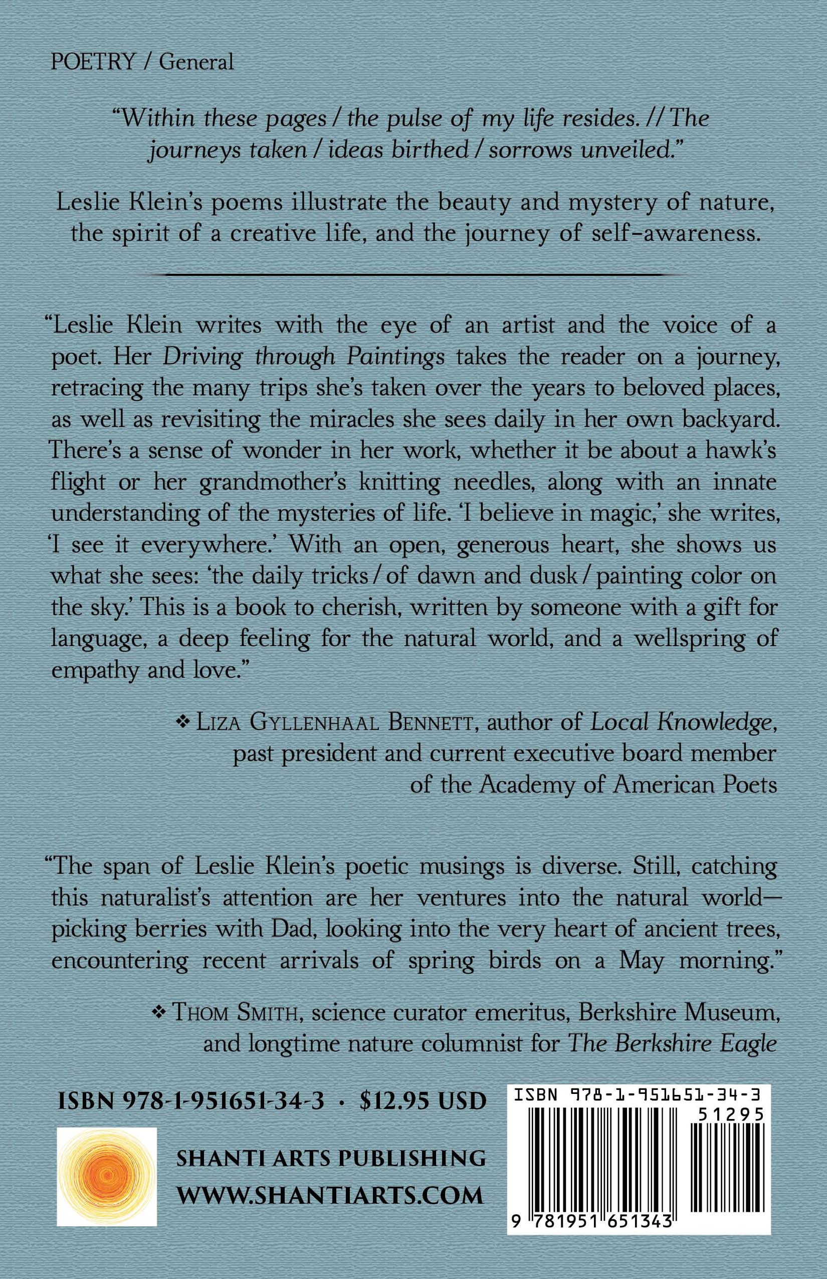 Leslie Klein writes with the eye of an artist and the voice of a poet. Her Driving through Paintings takes the reader on a journey—retracing the many trips she’s taken over the years to beloved places, as well as revisiting the miracles she sees daily in her own backyard. There’s a sense of wonder in her work—whether it be about a hawk’s flight or her grandmother’s knitting needles — along with an innate understanding of the mysteries of life. “I believe in magic,” she writes, “I see it everywhere.” With an open, generous heart, she shows us what she sees—“the daily tricks / of dawn and dusk / painting color on the sky.” This is a book to cherish, written by someone with a gift for language, a deep feeling for the natural world, and a wellspring of empathy and love.