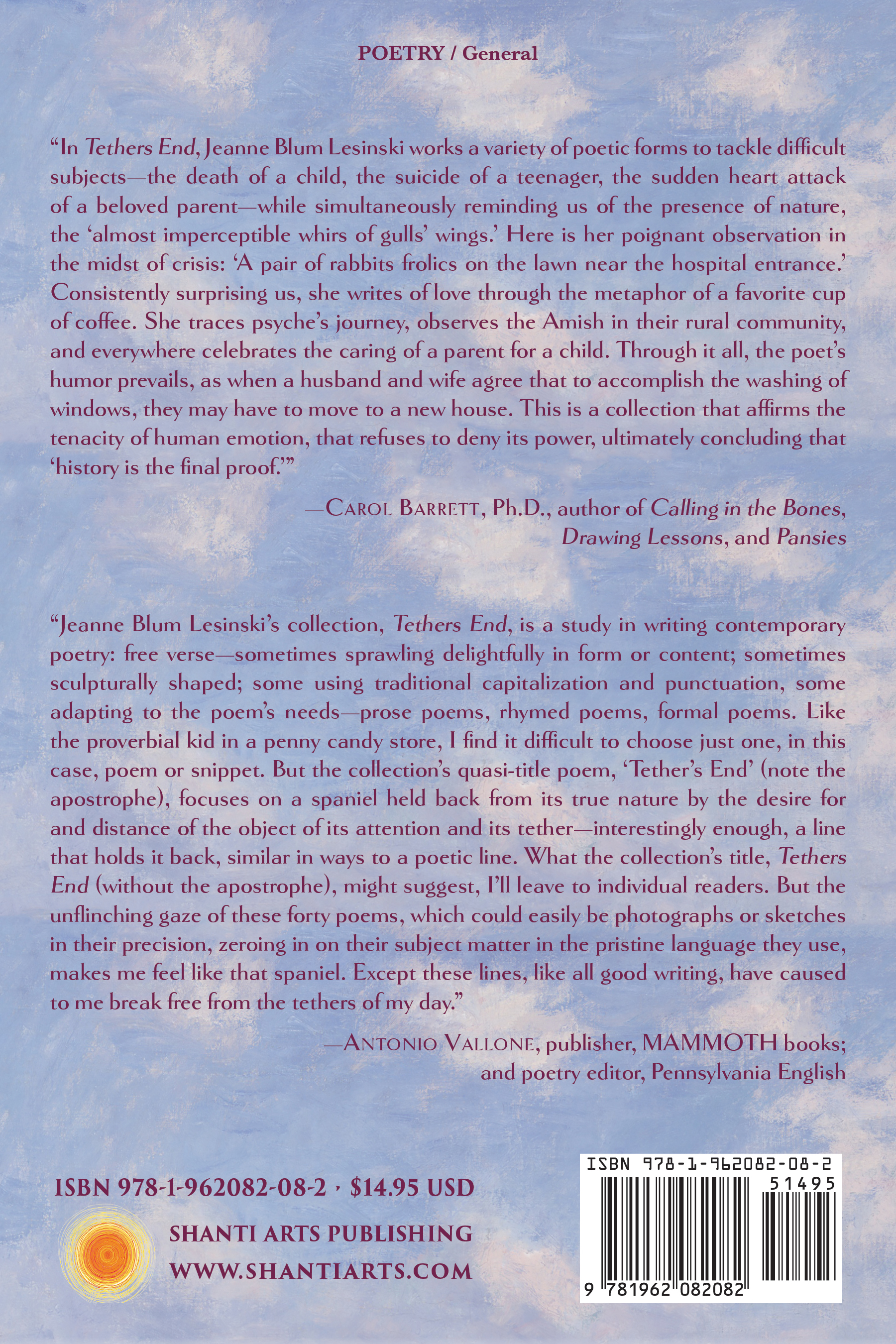 “In Tethers End, Jeanne Blum Lesinski works a variety of poetic forms to tackle difficult subjects—the death of a child, the suicide of a teenager, the sudden heart attack of a beloved parent—while simultaneously reminding us of the presence of nature, the ‘almost imperceptible whirs of gulls’ wings.’ Here is her poignant observation in the midst of crisis: ‘A pair of rabbits frolics on the lawn near the hospital entrance.’ Consistently surprising us, she writes of love through the metaphor of a favorite cup of coffee. She traces psyche’s journey, observes the Amish in their rural community, and everywhere celebrates the caring of a parent for a child. Through it all, the poet’s humor prevails, as when a husband and wife agree that to accomplish the washing of windows, they may have to move to a new house. This is a collection that affirms the tenacity of human emotion, that refuses to deny its power, ultimately concluding that ‘history is the final proof.’” “Jeanne Blum Lesinski’s collection, Tethers End, is a study in writing contemporary poetry: free verse—sometimes sprawling delightfully in form or content; sometimes sculpturally shaped; some using traditional capitalization and punctuation, some adapting to the poem’s needs—prose poems, rhymed poems, formal poems. Like the proverbial kid in a penny candy store, I find it difficult to choose just one, in this case, poem or snippet. But the collection’s quasi-title poem, ‘Tether’s End’ (note the apostrophe), focuses on a spaniel held back from its true nature by the desire for and distance of the object of its attention and its tether—interestingly enough, a line that holds it back, similar in ways to a poetic line. What the collection’s title, Tethers End (without the apostrophe), might suggest, I’ll leave to individual readers. But the unflinching gaze of these forty poems, which could easily be photographs or sketches in their precision, zeroing in on their subject matter in the pristine language they use, makes me feel like that spaniel. Except these lines, like all good writing, have caused to me break free from the tethers of my day.” |