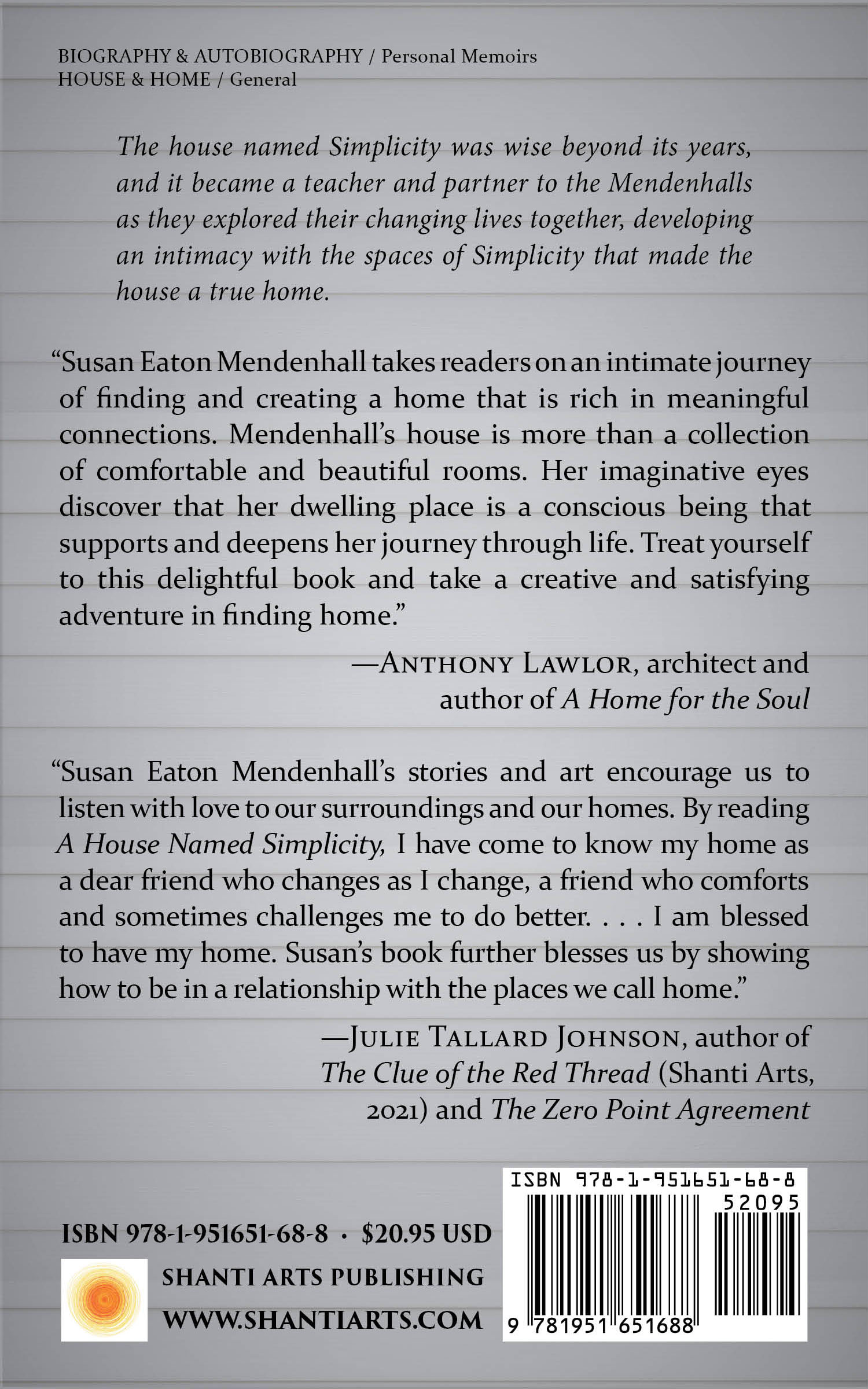 “‘It feels like home’ are words that every human heart longs to express. In A House Named Simplicity, Susan Eaton Mendenhall takes readers on an intimate journey of finding and creating a home that is rich in meaningful connections. Mendenhall’s house is more than a collection of comfortable and beautiful rooms. Her imaginative eyes discover that her dwelling place is a conscious being that supports and deepens her journey through life. Treat yourself to this delightful book and take a creative and satisfying adventure in finding home.” “Susan Mendenhall’s stories and art encourage us to listen with love to our surroundings and our homes. By reading A House Named Simplicity, I have come to know my home as a dear friend who changes as I change, a friend who comforts and sometimes challenges me to do better. When I moved into my new home a few years ago, Susan asked if my home had a name. I’ve named my cars, my pets, and of course my businesses, but never my homes. So with Susan’s encouragement, I asked my house what her name might be, and within a few days she spoke clearly to me: ‘My name is Red Tara.’ From that day on my conversations with my house have continued. I am blessed to have my home. Susan's book further blesses us by showing us how to be in a relationship with the places we call home.” “A wonderful read about a house that holds, protects, loves, serves and nurtures its occupants through the years. The author candidly shares her personal journey and life transformation during her time living within Simplicity.” “A House Named Simplicity is a fun and multi-dimensional read. With profound integrity to the point of vulnerability, each of Susan Mendenhall’s stories is a delicate weave of appreciation and respect toward spaces and objects that make a house a home. Each chapter feels like a sip of fine wine, leaving a distinct aftertaste, inviting the reader to self-inquiry.” “I never thought of my home as who I could become, only who I am.” “In A House Named Simplicity, Susan Eaton Mendenhall weaves a gentle tale about her house. The message is profound and introduces an important distinction: Do you occupy your house or treasure the space that you occupy? Susan welcomes the reader into her life and home to bring awareness to how we live in our spaces and how we live our lives.” “Susan Eaton Mendenhall and her house named Simplicity have regular soul-to-soul talks with each other. The unique language they speak developed over years of living together and making a house into a home. Come and join them in a meaningful read that will inspire conversations between you and the place you call home.” “Susan Eaton Mendenhall paints a picture of home not as a place, but as a relationship—at times inspiring and nurturing, and other times challenging and limiting. At its core, A House Named Simplicity is about the relationship we have with our deepest selves. I will never be able to see my own home in the same light.” “Susan Eaton Mendenhall describes both the joys and trials of creating a home out of an empty house in a small Wisconsin community. We join Susan and her new husband, Don, both artists, as they start their life together in Simplicity, a Midwestern foursquare structure that was once a hair salon on a main street. Now moved to a side street, the house has been transformed just as they have in their life together. A pleasure to read. A lesson in the delicate art of wise living.” “Susan's essays prompt me to consider the richness of a home's interior and the importance of its function in a way I'd never stopped to think about before. She guides us into a mindful relationship with our own living spaces as she describes the careful, grateful attention she employs in creating her own home.” “Susan shares her house with us in ways that wander into our own personal spaces, bringing wonder, allowing realizations of our own relationships with the spirit of place. Her attentiveness and her insightful stories of how a home is lived in open our awareness of how the very bones of a place frame us and our experiences and, in many discoverable and unexpected ways, invite us in return to be filled, emptied, lived out.” “Susan Mendenhall looks at the world with an artist’s sensibility. In A House Named Simplicity, she brings intimate home spaces to life with possibility, pattern, texture, color, and feeling. This generous, light-filled collection of stories reminds us of the ways our homes have their own personalities and guide us through our daily rituals. If you have ever felt connected to your home, or wanted to, this book is for you!” “Susan Mendenhall’s relationship with her home, which she named Simplicity, is a beautiful I-Thou relationship. A rare and poetic relationship of awareness upon awareness. With the sensitivity of the artist that Susan is, attending to space, flow, color, function, play, delight, harmony and, of course, beauty, she takes us through one experience after another in her personal life within her home, partnering with that structure beautifully, thoughtfully, and profoundly.” | |||||||||||||||||