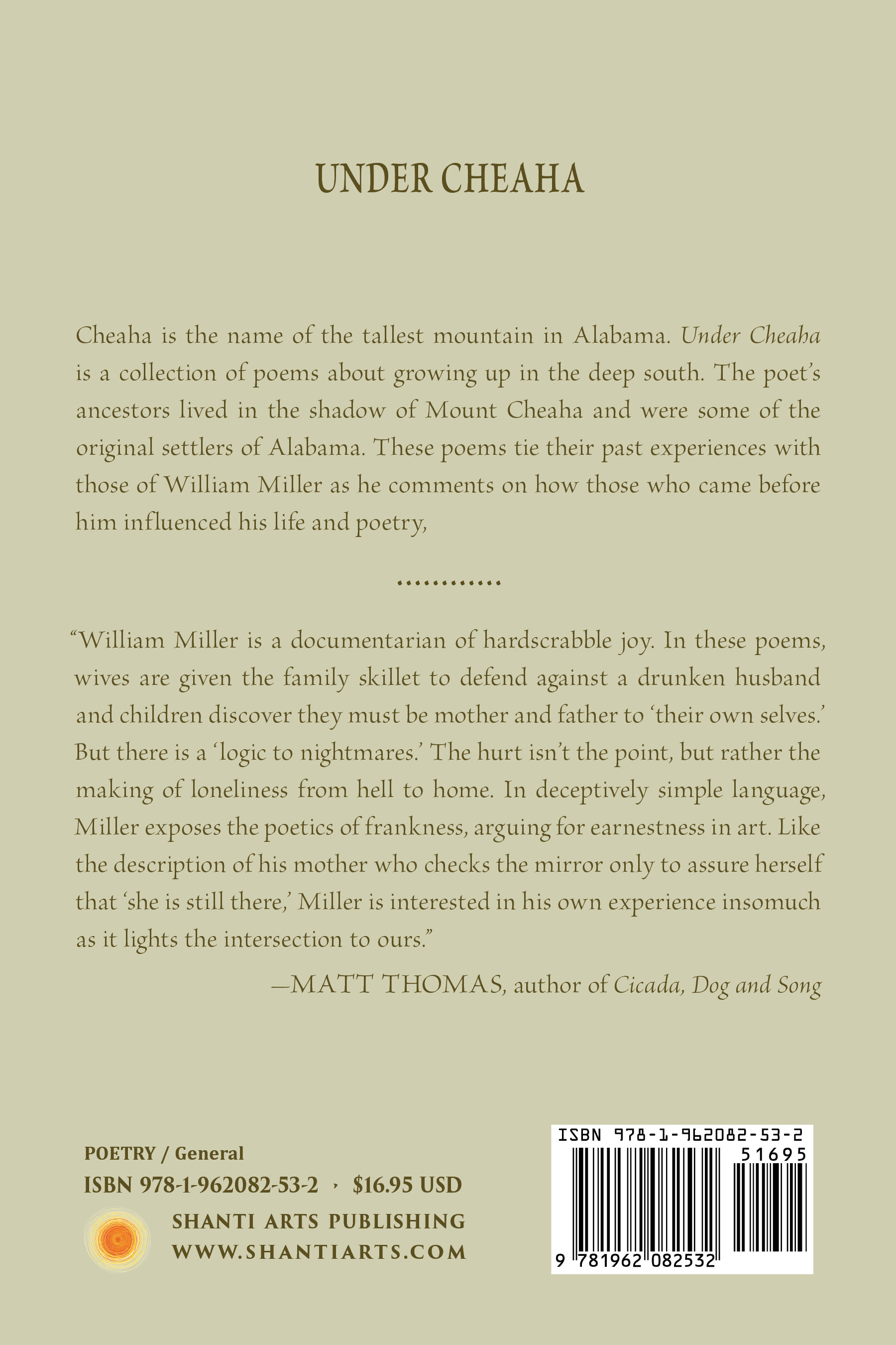Under Cheaha To pay by check please use this order form. We are pleased to take orders from retailers. Email us with details about your order or call us at 207-837-5760. Cheaha is the name of the tallest mountain in Alabama. Under Cheaha is a collection of poems by William Miller about growing up in the deep south. The poet’s ancestors lived in the shadow of Mount Cheaha and were some of the original settlers of Alabama. These poems tie their past experiences to those of Miller as he comments on how those who came before him influenced his life and poetry. POETRY / General ISBN: 978-1-962080-53-2 (print; softcover; perfect bound)LCCN: Released November 11, 2025; Copyright 2025 82 pages |