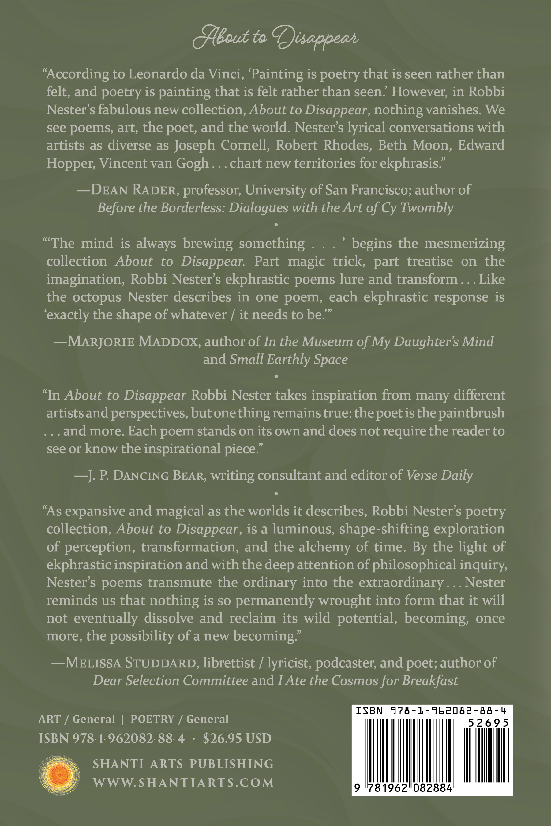 “According to Leonardo da Vinci, ‘Painting is poetry that is seen rather than felt, and poetry is painting that is felt rather than seen.’ However, in Robbi Nester’s fabulous new collection, About to Disappear, nothing vanishes. We see poems, art, the poet, and the world. Nester’s lyrical conversations with artists as diverse as Joseph Cornell, Robert Rhodes, Beth Moon, Edward Hopper, Vincent van Gogh, Pablo Picasso, Sally Gall, and even da Vinci himself chart new territories for ekphrasis. Indeed, About to Disappear functions like a gallery in which every poem could be on a wall, talking to everything else in the room. In one of her poems to van Gogh, Nester writes, ‘I feel blessed just to be here.’ I couldn’t agree more.” “‘The mind is always brewing something . . . ’ begins the mesmerizing collection About to Disappear. Part magic trick, part treatise on the imagination, Robbi Nester’s ekphrastic poems lure and transform. ‘Any plain ingredients,’ the poet explains, ‘can rise to the occasion, becoming / a new thing.’ Gathering memories, art, science, myth, history—even furniture, sea stars, and aliens—Nester delves deeper into and far beyond our own lives. Like the octopus Nester describes in one poem, each ekphrastic response is ‘exactly the shape of whatever / it needs to be.’” —Marjorie Maddox, author of In the Museum of My Daughter's Mind and Small Earthly Space “As expansive and magical as the worlds it describes, Robbi Nester’s poetry collection, About to Disappear, is a luminous, shape-shifting exploration of perception, transformation, and the alchemy of time. By the light of ekphrastic inspiration and with the deep attention of philosophical inquiry, Nester’s poems transmute the ordinary into the extraordinary as clouds reform, light shifts, and unseen ‘roots and tubers chart their path through darkness’ beneath cold earth. ‘Subject only to the weather, we / sail above you, understand solidity / as an illusion. In time, / wire rusts. Wood grows porous, / stone swells and contracts / so often it reverts / to sand,’ Nester writes, reminding us that nothing is so permanently wrought into form that it will not eventually dissolve and reclaim its wild potential, becoming, once more, the possibility of a new becoming.” “In About to Disappear Robbi Nester takes inspiration from many different artists and perspectives, but one thing remains true: the poet is the paintbrush . . . and more. Each poem stands on its own and does not require the reader to see or know the inspirational piece. You may want to check out the art later, but there is no need to see the pieces to understand the poems.” |
