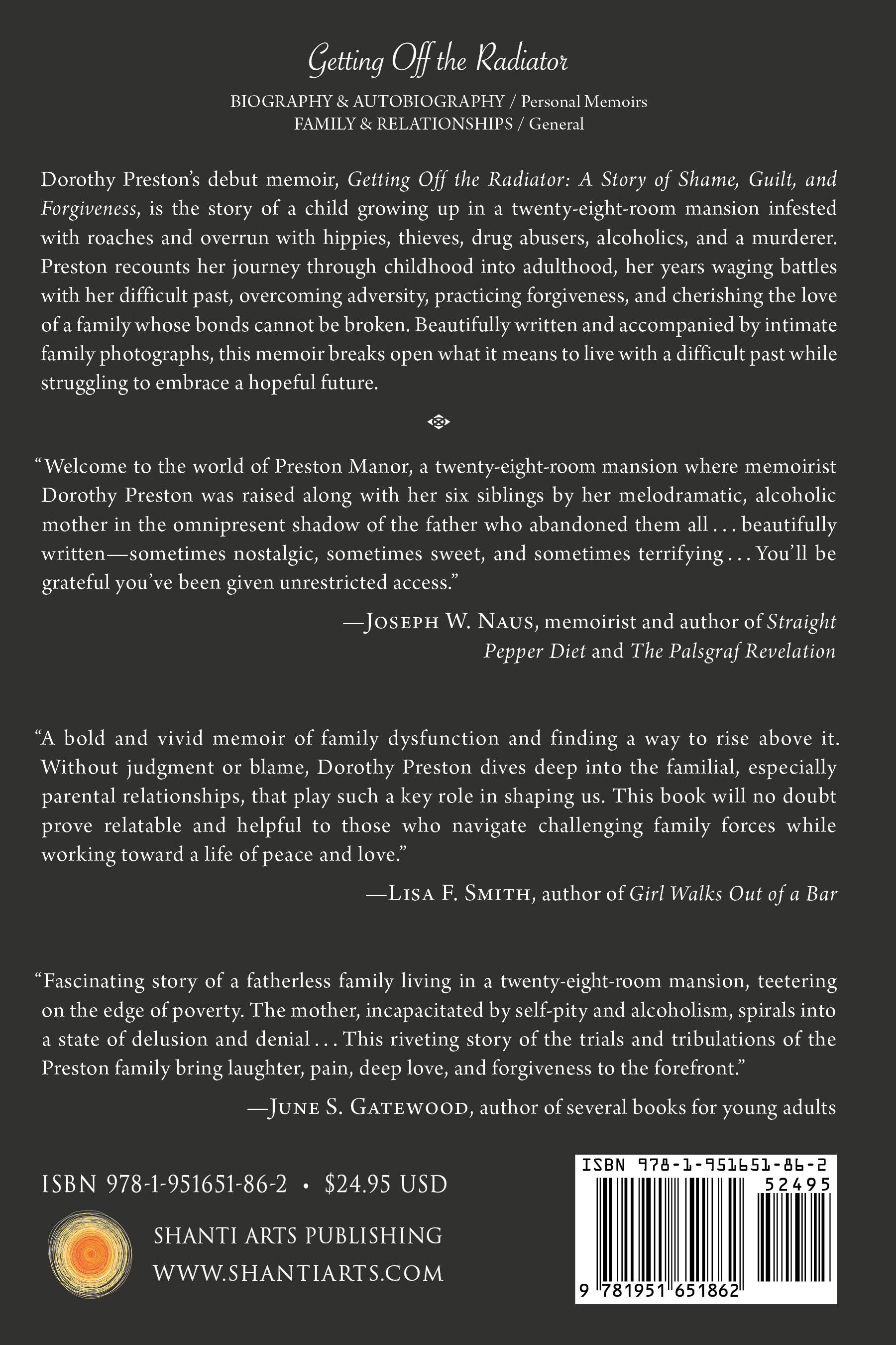 Endorsements “Getting Off the Radiator is a bold and vivid memoir of family dysfunction and finding a way to rise above it. Without judgment or blame, Dorothy Preston dives deep into the familial, especially parental relationships that play such a key role in shaping us. This book will no doubt prove relatable and helpful to those who navigate challenging family forces while working toward a life of peace and love. “Fascinating story of a fatherless family living in a 28-room mansion teetering on the edge of poverty. The mother, incapacitated by self-pity and alcoholism, spirals into a state of delusion and denial . . . This riveting story of the trials and tribulations of the Preston family bring laughter, pain, deep love, and forgiveness to the forefront.” |