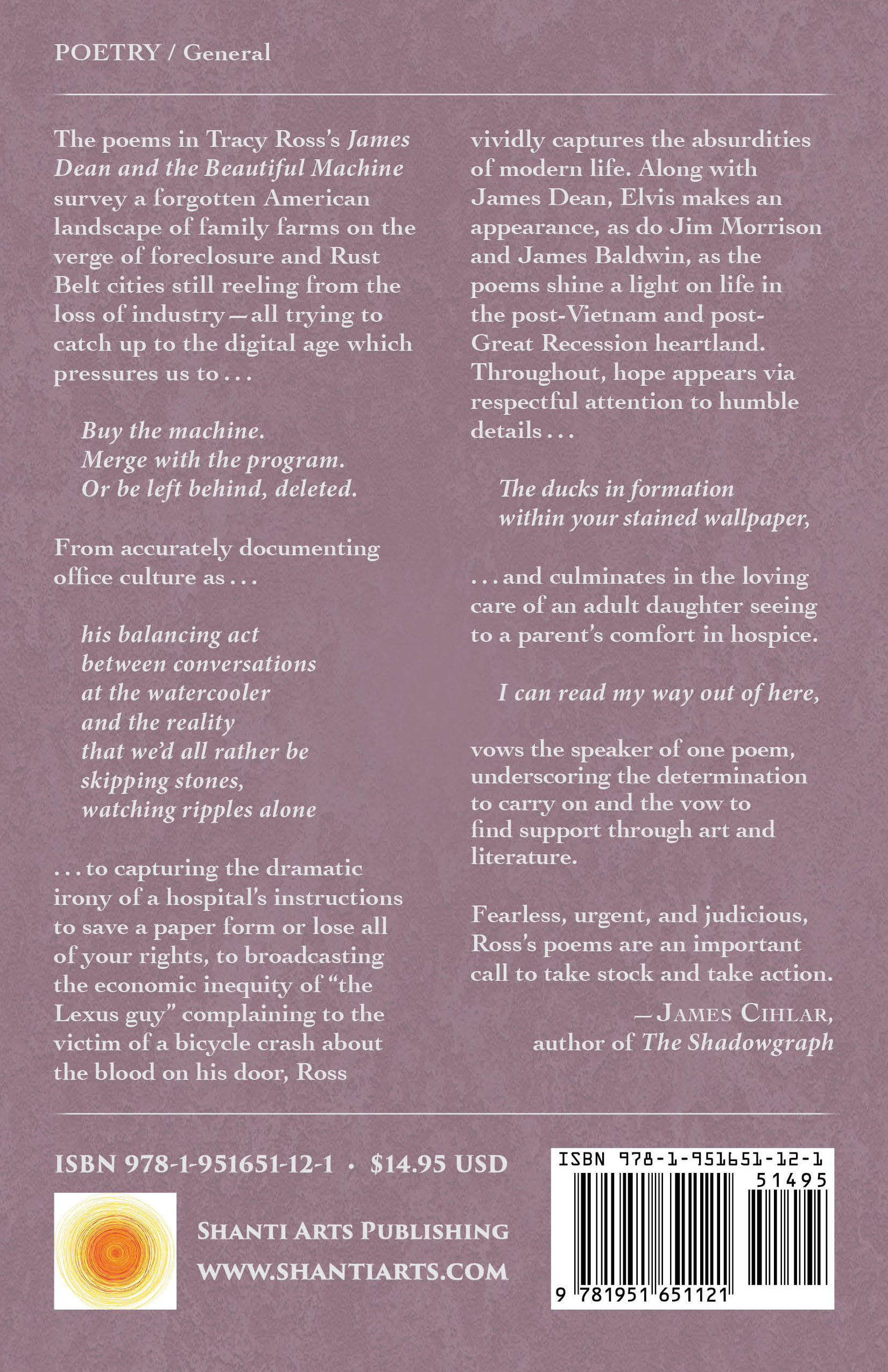 The poems in Tracy Ross’s James Dean and the Beautiful Machine survey a forgotten American landscape of family farms on the verge of foreclosure and Rust Belt cities still reeling from the loss of industry—all trying to catch up to the digital age which pressures us to . . . Buy the machine. From accurately documenting office culture as . . . his balancing act . . . to capturing the dramatic irony of a hospital’s instructions to save a paper form or lose all of your rights, to broadcasting the economic inequity of “the Lexus guy” complaining to the victim of a bicycle crash about the blood on his door, Ross vividly captures the absurdities of modern life. Along with James Dean, Elvis makes an appearance, as do Jim Morrison and James Baldwin, as the poems shine a light on life in the post-Vietnam and post-Great Recession heartland. Throughout, hope appears via respectful attention to humble details . . . The ducks in formation . . . and culminates in the loving care of an adult daughter seeing to a parent’s comfort in hospice. I can read my way out of here, vows the speaker of one poem, underscoring the determination to carry on and the vow to find support through art and literature. Fearless, urgent, and judicious, Ross’s poems are an important call to take stock and take action. |