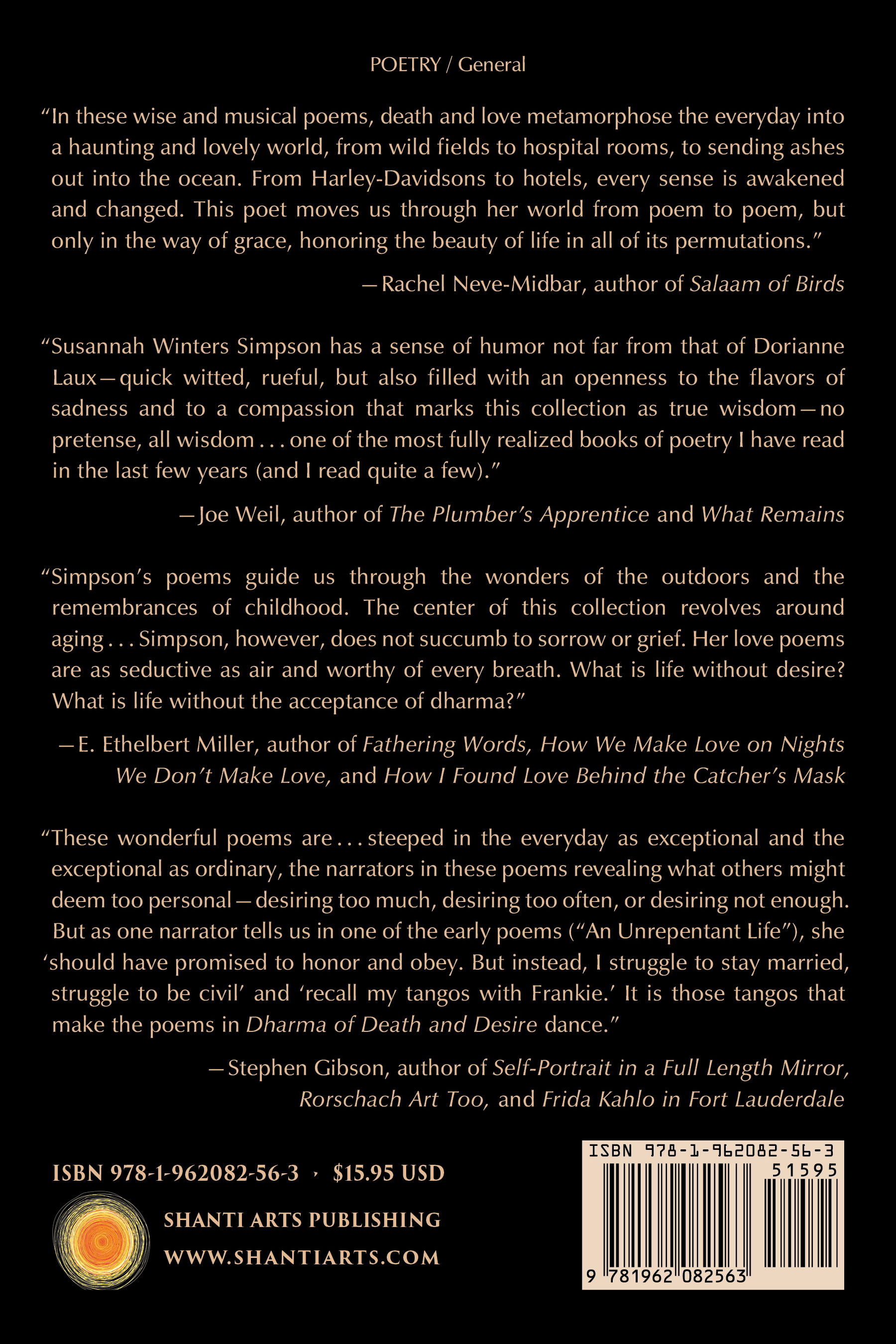 “‘Death distorts your vision.’ But so does love, according to the generous and readable poems in Susannah Winters Simpson's book Dharma of Death and Desire. In these wise and musical poems, death and love metamorphize the everyday into a haunting and lovely world, from wild fields to hospital rooms, to sending ashes out into the ocean. From Harley Davidsons to hotels, every sense is awakened and changed. This poet moves us through her world from poem to poem, but only in the way of grace, honoring the beauty of life in all of its permutations.” “Susannah Winters Simpson has a sense of humor not far from that of Dorianne Laux—quick witted, rueful, but also filled with an openness to the flavors of sadness and to a compassion that marks this collection as true wisdom—no pretense, all wisdom. Each poem brings its own pleasure and completeness, but the overall effect is that of a poet at the top of her game. Dharma of Death and Desire is one of the most fully realized books of poetry I have read in the last few years (and I read quite a few).” “The poetry of Susannah Winters Simpson is a reminder that many of us are always waiting for signs so that we might renew our faith. Poetry has the ability to escort the reader into a deeper understanding of oneself. Simpson’s poems guide us through the wonders of the outdoors and the remembrances of childhood. The center of this collection revolves around aging. Dharma of Death and Desire will hold your hand in the hospital and hospice. Simpson, however, does not succumb to sorrow or grief. Her love poems are as seductive as air and worthy of every breath. What is life without desire? What is life without the acceptance of dharma?” “These wonderful poems are rooted in memory, and as such, they are steeped in the everyday as exceptional and the exceptional as ordinary, the narrators in these poems revealing what others might deem too personal—desiring too much, desiring too often, or desiring not enough. But as one narrator tells us in one of the early poems (‘An Unrepentant Life’), she ‘should have promised to honor and obey. But instead, I struggle to stay married, struggle to be civil’ and ‘recall my tangos with Frankie.’ It is those tangos that make the poems in Dharma of Death and Desire dance.” |