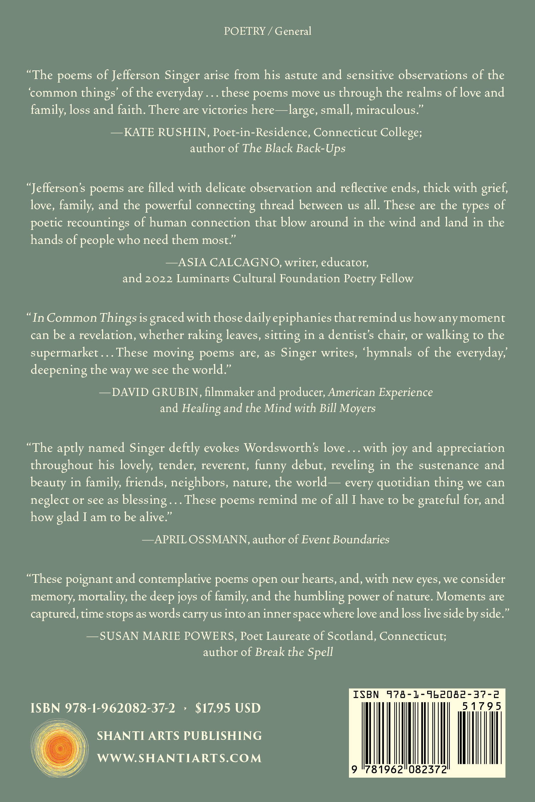 “The poems of Jefferson Singer arise from his astute and sensitive observations of the ‘common things’ of the everyday, as well as our common, human experiences. Whether contemplating a visit to an amusement park, watching a baseball game on T.V., or hiking with a friend, these poems move us through the realms of love and family, loss and faith. There are victories here—large, small, miraculous.” “Jefferson's poems are filled with delicate observation and reflective ends, thick with grief, love, family, and the powerful connecting thread between us all. These are the types of poetic recountings of human connection that blow around in the wind and land in the hands of people who need them most.” “In Common Things is graced with those daily epiphanies that remind us how any moment can be a revelation, whether raking leaves, sitting in a dentist’s chair, or walking to the supermarket. These moving poems are, as Singer writes, ‘hymnals of the everyday,’ deepening the way we see the world.” “The aptly named Singer deftly evokes Wordsworth’s love, ‘the life / In common things,’ with joy and appreciation throughout his lovely, tender, reverent, funny debut, reveling in the sustenance and beauty in family, friends, neighbors, nature, the world—every quotidian thing we can neglect or see as blessing: ‘witness I did not miss / the henna-haired woman / singing with the windows / of her white Volvo open.’ These poems remind me of all I have to be grateful for, and how glad I am to be alive.” “These poignant and contemplative poems open our hearts, and, with new eyes, we consider memory, mortality, the deep joys of family, and the humbling power of nature. Moments are captured, time stops as words carry us into an inner space where love and loss live side by side.” “I’m grateful for this beautiful collection of poems that explores the relationships, prayers, landscapes, and so-called ordinary moments of our lives ‘that held our gaze / caught our breath before we slept again.’ The experience of reading In Common Things felt diastolic; I paused and received poems of loss and joy and necessary, life-giving rhythms.” “From the homage to negative space in ‘Dave Righetti’s No-hitter, July 4, 1983’ to the teasing out of what is truly important in ‘In Common Things’, Jefferson Singer subtly invites us to reexamine what we see as valuable. He deftly takes us through a closer look at the often overlooked and a questioning of the obvious. The people he loves shine throughout In Common Things. After reading it, I want to meet them all, his entire family. I even want to go to his dental hygienist and the man who cuts his hair.” |
