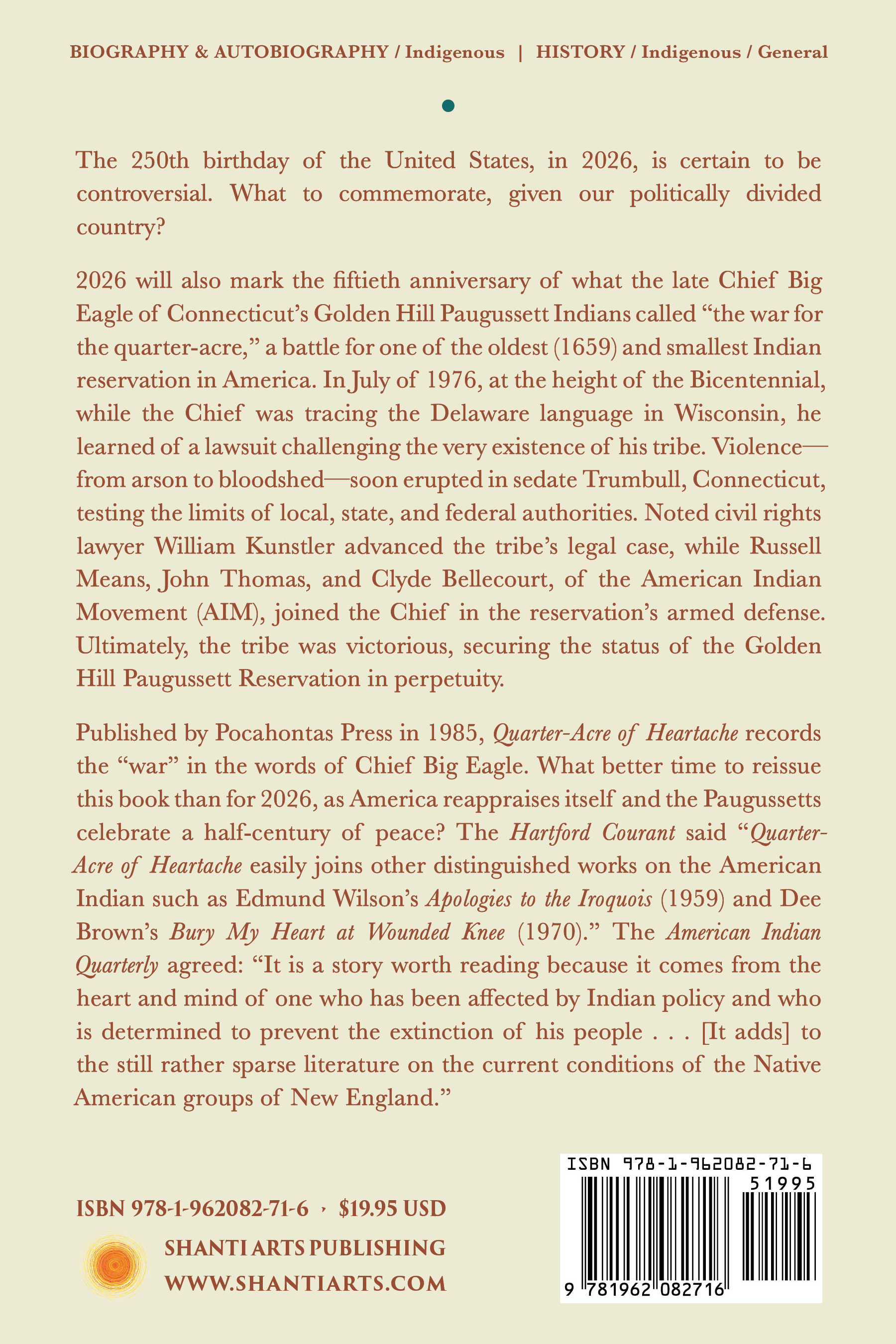 Quarter-Acre of Heartache To pay by check please use this order form. An ebook edition of this title is available from Amazon Kindle Bookstore. We are pleased to take orders from retailers. Email us with details about your order or call us at 207-837-5760. America will celebrate its 250th birthday in 2026; that year will also mark the fiftieth anniversary of what the late Chief Big Eagle of Connecticut’s Golden Hill Paugussett Indians called “the war for the quarter-acre,” a battle for one of the oldest (1659) and smallest Indian reservation in America. In July of 1976, at the height of the Bicentennial, while the Chief was tracing the Delaware language in Wisconsin, he learned of a lawsuit challenging the very existence of his tribe. Violence—from arson to bloodshed—soon erupted in sedate Trumbull, Connecticut, testing the limits of local, state, and federal authorities. Noted civil rights lawyer William Kunstler advanced the tribe’s legal case, while Clyde Bellecourt and Russell Means, of the American Indian Movement, joined the Chief in the reservation’s armed defense. Ultimately, the tribe was victorious, securing the status of the Golden Hill Paugussett Reservation in perpetuity. Quarter-Acre of Heartache uses the voice of Chief Big Eagle to recount the story of his tribe's survival. BIOGRAPHY & AUTOBIOGRAPHY / Indigenous ISBN: 978-1-962082-71-6 (print; softcover; perfect bound ) Released June 17, 2025 | Copyright 2025 164 pages; 30 black-and-white images |