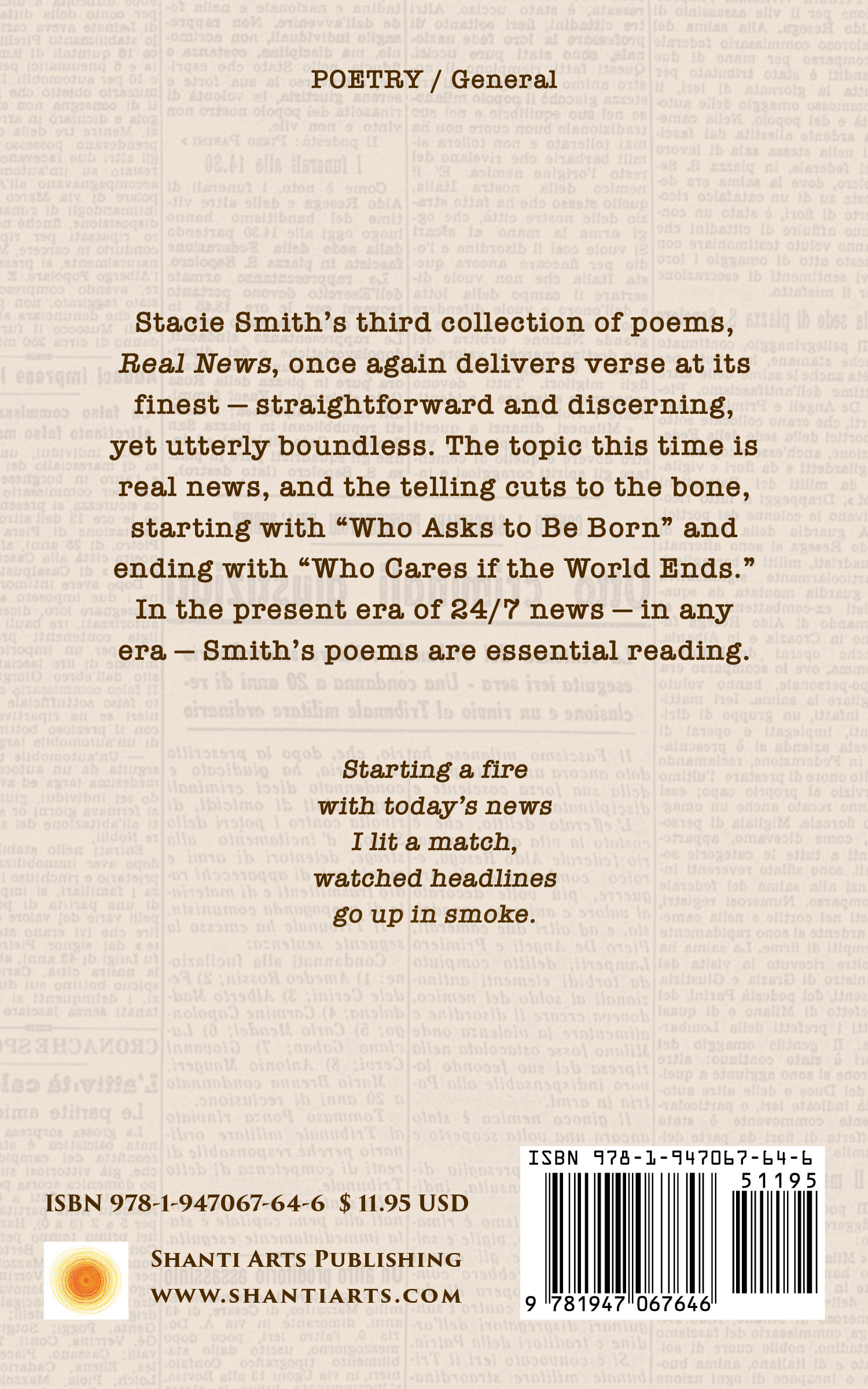 Real News To pay by check please use this order form. We are pleased to take orders from retailers. Email us with details about your order or call us at 207-837-5760. Stacie Smith’s third collection of poems, Real News, once again delivers verse at its finest — straightforward and discerning, yet utterly boundless. The topic this time is real news, and the telling cuts to the bone, starting with “Who Asks to Be Born” and ending with “Who Cares if the World Ends.” In the present era of 24/7 news — in any era — Smith’s poems are essential reading. “Starting a fire / with today’s news / I lit a match, / watched headlines / go up in smoke.” ISBN: 978-1-947067-64-6 (print; softcover; perfect bound) 82 pages |