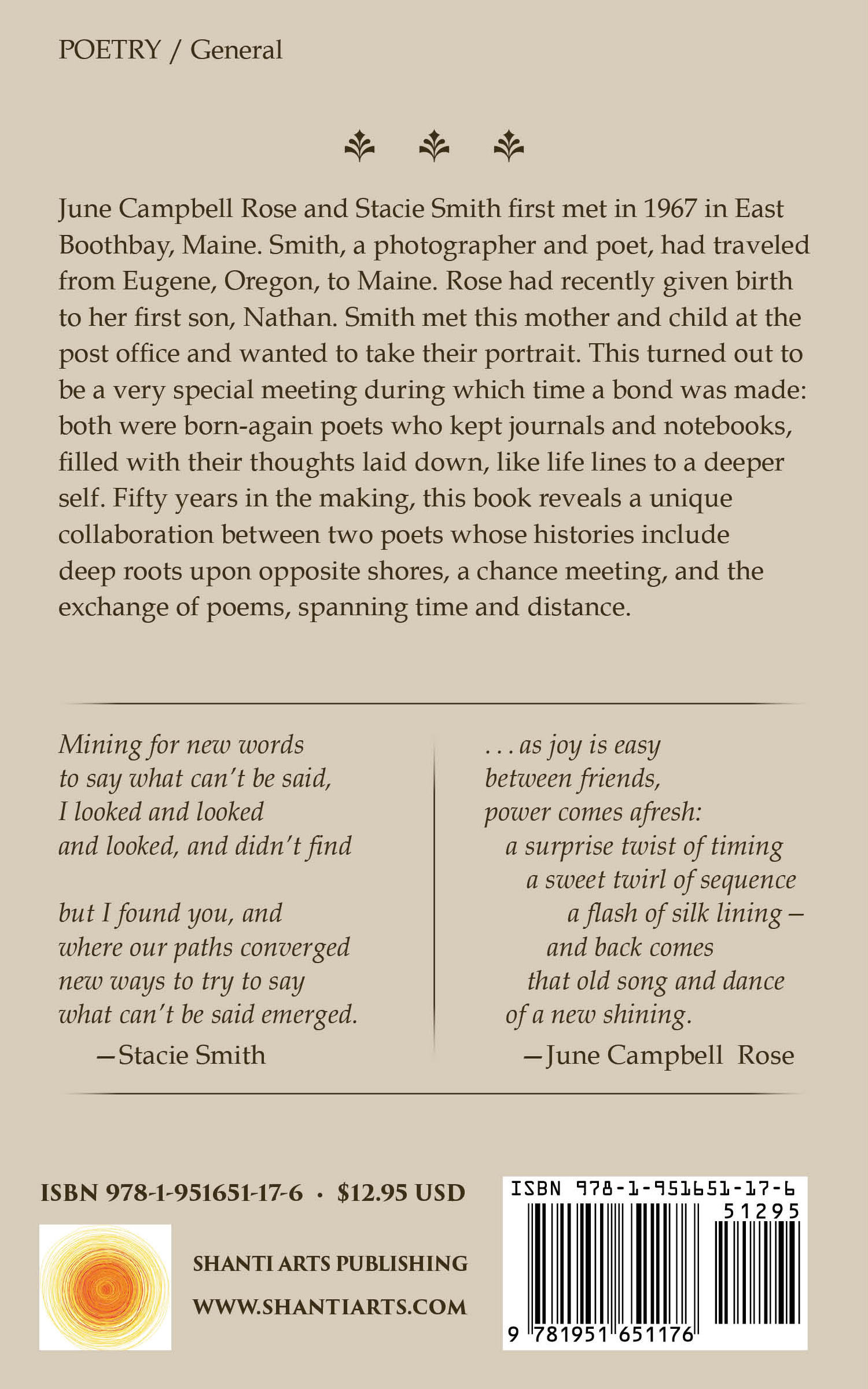 Second Sight To pay by check please use this order form. We are pleased to take orders from retailers. Email us with details about your order or call us at 207-837-5760. June Campbell Rose and Stacie Smith first met in 1967 in East Boothbay, Maine. Smith, a photographer and poet, had traveled from Eugene, Oregon, to Maine. Rose had recently given birth to her first son, Nathan. Smith met this mother and child at the post office and wanted to take their portrait. This turned out to be a very special meeting during which time a bond was made: both were born-again poets who kept journals and notebooks, filled with their thoughts laid down, like life lines to a deeper self. Fifty years in the making, this book reveals a unique collaboration between two poets whose histories include deep roots upon opposite shores, a chance meeting, and the exchange of poems, spanning time and distance. POETRY / General ISBN: 978-1-951651-17-6 (print; softcover; perfect bound) Released April 2020 90 pages |