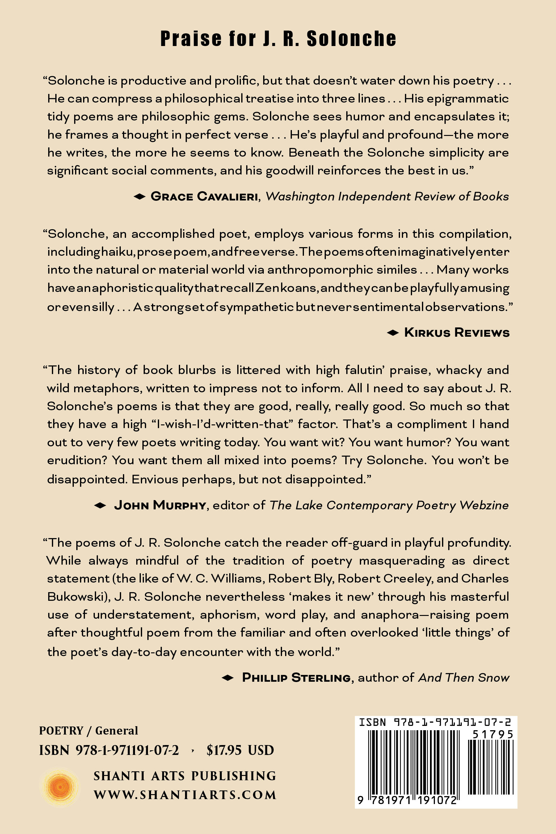 “Solonche is productive and prolific, but that doesn’t water down his poetry . . . He can compress a philosophical treatise into three lines . . . His epigrammatic tidy poems are philosophic gems. Solonche sees humor and encapsulates it; he frames a thought in perfect verse . . . He’s playful and profound—the more he writes, the more he seems to know. Beneath the Solonche simplicity are significant social comments, and his goodwill reinforces the best in us.” “Solonche, an accomplished poet, employs various forms in this compilation, including haiku, prose poem, and free verse. The poems often imaginatively enter into the natural or material world via anthropomorphic similes . . . Many works have an aphoristic quality that recall Zen koans, and they can be playfully amusing or even silly . . . A strong set of sympathetic but never sentimental observations.” “The history of book blurbs is littered with high falutin’ praise, whacky and wild metaphors, written to impress not to inform. All I need to say about J. R. Solonche’s poems is that they are good, really, really good. So much so that they have a high “I-wish-I’d-written-that” factor. That’s a compliment I hand out to very few poets writing today. You want wit? You want humor? You want erudition? You want them all mixed into poems? Try Solonche. You won’t be disappointed. Envious perhaps, but not disappointed.” “The poems of J. R. Solonche catch the reader off-guard in playful profundity. While always mindful of the tradition of poetry masquerading as direct statement (the like of W. C. Williams, Robert Bly, Robert Creeley, and Charles Bukowski), J. R. Solonche nevertheless ‘makes it new’ through his masterful use of understatement, aphorism, word play, and anaphora—raising poem after thoughtful poem from the familiar and often overlooked ‘little things’ of the poet’s day-to-day encounter with the world.” |
