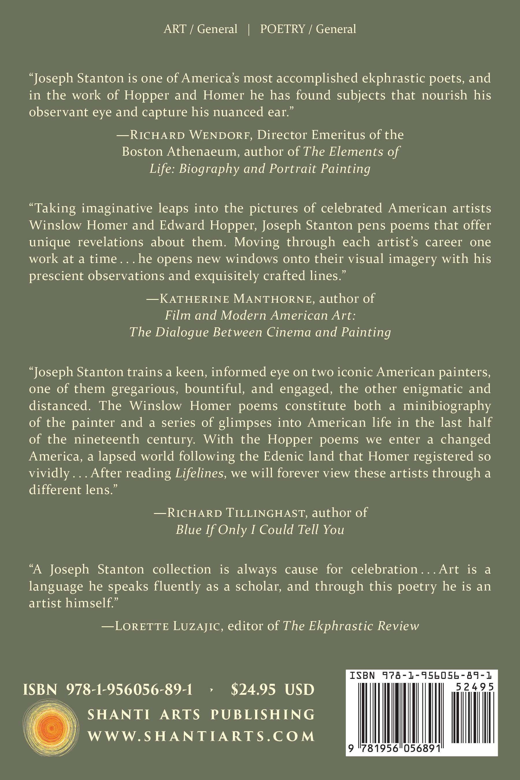 “As Joseph Stanton well knows and has demonstrated in his various books of ekphrastic poetry, paintings speak. All one has to do is listen. In the poems in this volume, the paintings of Winslow Homer and Edward Hopper speak powerful messages on war, nature, the situations of women, the city, life, love, and death—all to the benefit of the artists and the readers of this impressive book that celebrates both paintings and poetry.” “Joseph Stanton is one of America’s most accomplished ekphrastic poets, and in the work of Hopper and Homer he has found subjects that nourish his observant eye and capture his nuanced ear.” “Edward Hopper’s paintings have long engaged poets, just as poetry—from Verlaine to Frost—engaged Hopper. Joseph Stanton’s poems not only relate to what Hopper painted, but also to the painter’s biography. These evocative poems take the reader closer to the essence of Hopper’s images and even sometimes to his feisty relationship with his wife, Jo. Hopper himself would not have minded being paired with poems about Winslow Homer, an artist whom he admired.” “As both an art historian and a poet, Joseph Stanton brings a unique perspective to bear on his thinking about works of art. He has written on a wide range of historic and contemporary art . . . In Lifelines: Poems for Winslow Homer and Edward Hopper, Stanton continues to create imaginary exhibitions in literary museums whose contents juxtapose images and provoke ideas. In this installment he focuses on two classic American painters: Winslow Homer and Edward Hopper. Drawing upon his professional experience and aesthetic sense, Stanton gives voice to these silent works of visual art. The poems not only complement each other, but illuminate and deepen our understanding of the paintings. Adding to these reflections on our everyday world are observations regarding the psychology of a simple setting. Whether there are isolated figures sitting in a late-night diner, or a young whippersnapper trailing at the end of a crack-the-whip game, an undeniable tension comes into play. It is this tension, both plastic and poetic, that gives Joseph Stanton’s work its unique importance.” “Taking imaginative leaps into the pictures of celebrated American artists Winslow Homer and Edward Hopper, Joseph Stanton pens poems that offer unique revelations about them. Moving through each artist’s career one work at a time, roughly in the order they were created, he opens new windows onto their visual imagery with his prescient observations and exquisitely crafted lines. Interpretations of pictorial details lead him to suggest absences and yearnings in their personal lives, which can be intriguing—though tricky—given that both attempted to thwart any invasion of their privacy. Homer’s bachelor life, fishing and hunting, between the Civil War and the Spanish American War is differentiated by subtle shifts in vocabulary and poetic style from Hopper’s twentieth century primarily urban existence and his complex relationship with his wife, Jo. Stanton’s skillful wielding of the ekphrastic stance brings alternative perspectives to the ‘so-long-lonely Winslow’ and Hopper, ‘Puritan by birth, sensualist at heart.’ Both seasoned readers of the burgeoning literature on these two revered figures and those just discovering them will be inspired by Lifelines.” “Lifelines: Poems for Winslow Homer and Edward Hopper develops unexpectedly, like a story, in chronological order, year by year—until the pattern is disrupted. The poems are in the tradition of ekphrasis, with their individual focuses on specific works of art, while taken together they create a kind of art history in/as poetry. The values of the artists’ times, not of ours, come to life. Recurring themes of humor, wit, and games are woven throughout the Winslow Homer poems, then echoed in a few of the Edward Hopper poems, including, significantly, the concluding poem, ‘Two Comedians, 1965’ This structure, together with Joseph Stanton’s, deceptively simple, lucid descriptions throughout, offer a unique vision of how two artists explored life, love, and mortality.” “Joseph Stanton’s Lifelines: Poems for Winslow Homer and Edward Hopper trains a keen, informed eye on two iconic American painters, one of them gregarious, bountiful, and engaged, the other enigmatic and distanced. The Winslow Homer poems constitute both a minibiography of the painter and a series of glimpses into American life in the last half of the nineteenth century. With the Hopper poems we enter a changed America, a lapsed world following the Edenic land that Homer registered so vividly. The sparely framed Hopper poems echo the artist’s vision of American loneliness, ennui, and unrealized dreams. After reading Lifelines, we will forever view these artists through a different lens.” “A Joseph Stanton collection is always cause for celebration, and this rich poetic examination of two enigmatic American artists is a rich addition to the ekphrastic world. Stanton looks confidently at canvas after canvas, reading scenes and symbols, as well as angles and frames and colors and compositions. Art is a language he speaks fluently as a scholar, and through this poetry he is an artist himself.” “These are indeed lifelines—poems covering almost forty years of Homer’s paintings and a half-century of Hopper’s. Over decades, Joseph Stanton has studied the lives and works of these two artists and written poems about them. What strikes this reader is the shape of the book, both of each half and of the book as a whole. It is uncanny how poems written at different times, but now arranged by the chronology of the paintings, connect each with the next in a kind of natural order. With poet Joseph Stanton as our guide, we can enter into the minds and hearts of these two iconic American artists to see what they see—Homer’s natural and human landscapes, Hopper’s haunting li