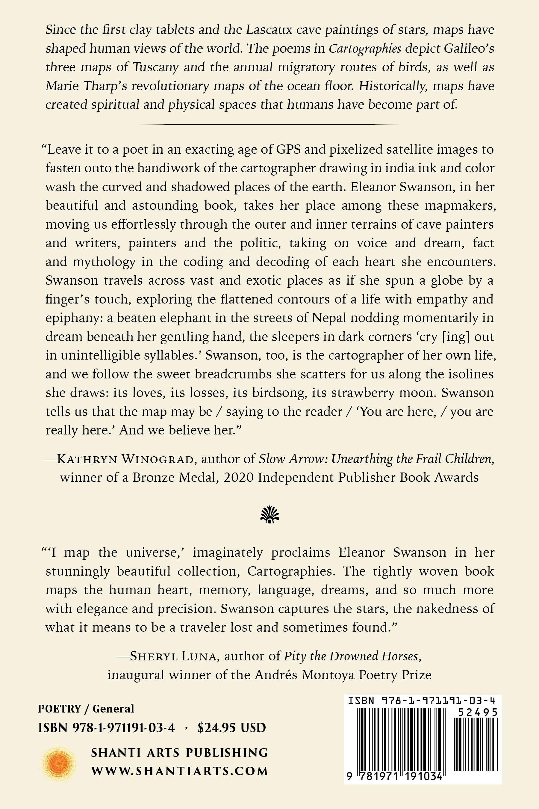 “Leave it to a poet in an exacting age of GPS and pixelized satellite images to fasten onto the handiwork of the cartographer drawing in india ink and color wash the curved and shadowed places of the earth. Eleanor Swanson, in her beautiful and astounding book, takes her place among these mapmakers, moving us effortlessly through the outer and inner terrains of cave painters and writers, painters and the politic, taking on voice and dream, fact and mythology in the coding and decoding of each heart she encounters. Swanson travels across vast and exotic places as if she spun a globe by a finger’s touch, exploring the flattened contours of a life with empathy and epiphany: a beaten elephant in the streets of Nepal nodding momentarily in dream beneath her gentling hand, the sleepers in dark corners ‘cry [ing] out in unintelligible syllables.’ Swanson, too, is the cartographer of her own life, and we follow the sweet breadcrumbs she scatters for us along the isolines she draws: its loves, its losses, its birdsong, its strawberry moon. Swanson tells us that the map may be / saying to the reader / ‘You are here, / you are really here.’ And we believe her.” “‘I map the universe,’ imaginately proclaims Eleanor Swanson in her stunningly beautiful collection, Cartographies. The tightly woven book maps the human heart, memory, language, dreams, and so much more with elegance and precision. Swanson captures the stars, the nakedness of what it means to be a traveler lost and sometimes found.” |