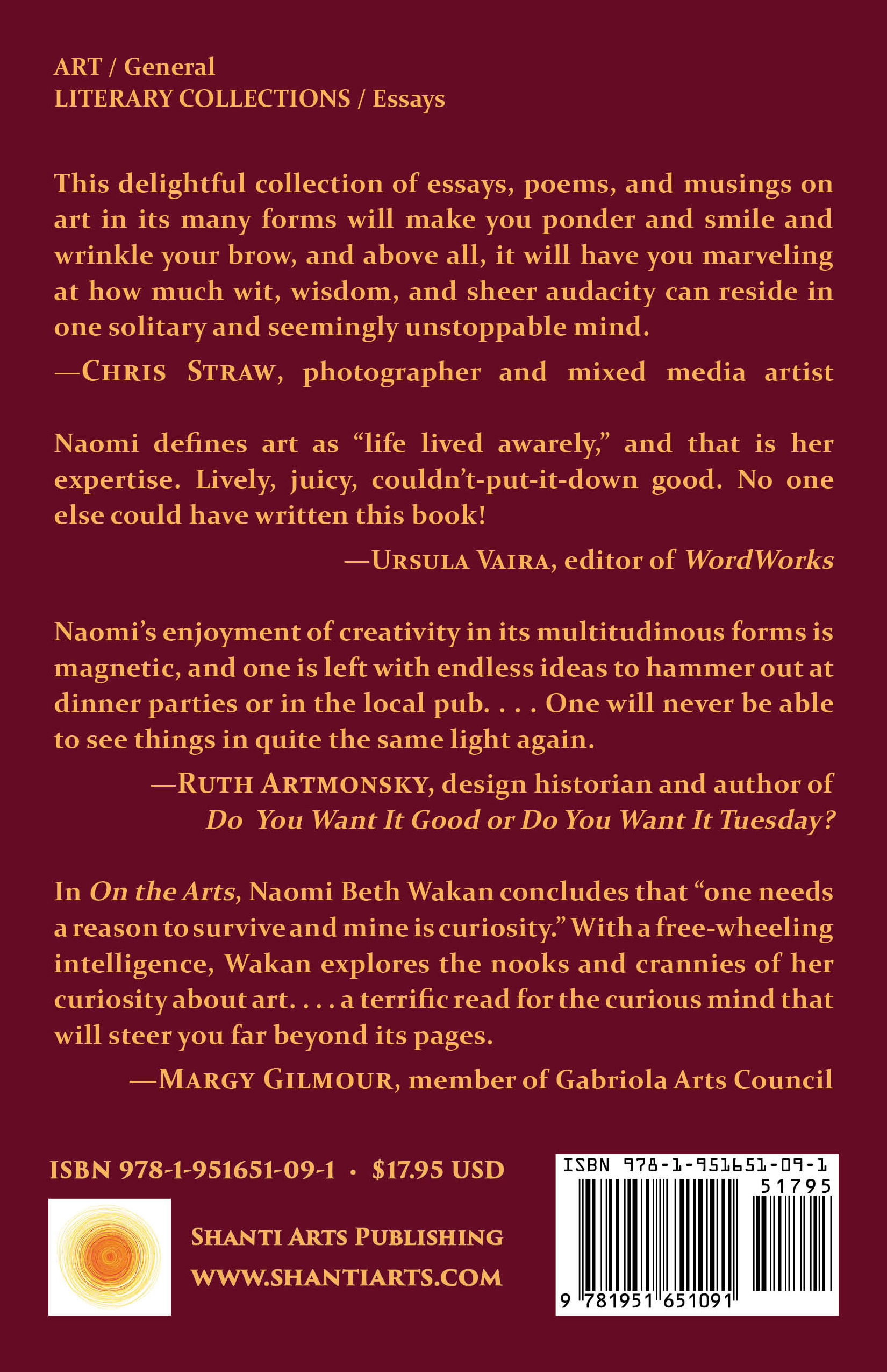 “In On the Arts, the irrepressible Naomi Beth Wakan shares with us the impressive results of an intellectual life lived to its fullest. This delightful collection of essays, poems, and musings on art in its many forms will make you ponder and smile and wrinkle your brow and above all it will have you marveling at how much wit, wisdom, and sheer audacity can reside in one solitary and seemingly unstoppable mind.” “Naomi's lively voice takes us into an overview of the arts from the art of flower arranging to the art of flamenco, from short story writing to the art of survival, film noir to bel canto. Naomi defines art as "life lived awarely," and that is her expertise. Lively, juicy, couldn't-put-it-down good. No one else could have written this book!” “Naomi Beth Wakan's On the Arts should come with a health warning for one is left breathless coming to the last page of her enthusiasms and her erudite interests. Her enjoyment of creativity in its multitudinous forms is magnetic and one is left with endless ideas to hammer out at dinner parties or in the local pub. With a book list of "must reads" that will take one over more than a summer holiday; and one will never be able to see things in quite the same light again.” “Spoiler alert: In her latest book, Naomi Beth Wakan concludes that "one needs a reason to survive and mine is curiosity." With a free-wheeling intelligence, Wakan explores the nooks and crannies of her curiosity about art—what is art? can craft be art? what is creativity?—and transports the reader on a captivating journey into which she weaves poetry, quotes, and reflections about her own life in art. On the Arts is a terrific read for the curious mind and will steer you far beyond its pages.” “Naomi Beth Wakan’s wide-ranging take on ‘The Arts,’ with chapters such as the Art of Faking and the Art of Survival, is a refreshing read that will have you alternately nodding, shaking your head, or laughing out loud. In her thought-provoking and entertaining book, Wakan challenges the reader to see the creativity and art that is found all around us; indeed in life itself.” |