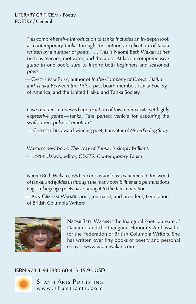 "What a wonderful and delightful work! My sincere congratulations to you on your significant accomplishment in producing a text that I believe will quickly become a standard in tanka education. Having read it, I felt as if I had taken a personal seminar with a great teacher who cares deeply about the subject.” “ . . . a long-awaited addition to the world of tanka. Bringing her extensive experiences as a tanka poet together, Wakan invites you to learn about the art of writing tanka. For beginners, it will serve as an indispensable introduction to tanka, and for experienced tanka poets, it will provide an excellent opportunity to reflect on their tanka writing. You will also simply enjoy reading a fair number of tanka poems by several poets, including the author, dispersed throughout the book. . . . Wakan’s book not only helps budding and experienced poets to learn and review the basics of tanka and keep writing tanka of their own, but also, at the same time, it will be used as a basis for evaluating tanka written by others to keep current with movement in the contemporary tanka world in which they are placed. This is an excellent book, and I am delighted that I have encountered it.” "This book is a comprehensive introduction to tanka. I recommend it to experienced tanka poets who might consider buying it, reading it, and then perhaps passing it on to a poet new to the form. The Way of Tanka has a crisp, authoritative, confident touch. It is an explanation of tanka at its best, expertly tuned to the personal, in which every chapter is the mot juste in the melody of the whole. It is a collection that richly satisfies eye, ear, and heart.” "While the English-language market has offered tanka collections and academic-leaning books about Japanese poetry, this is the first comprehensive guide to writing tanka. Wakan packs a lot into 144 pages, and it is delivered with characteristic Wakan 'tone': honest, up-front, often witty, and playful. This is a book I recommend you read all the way through, as Wakan takes the reader on her journey in search of the essence of tanka." "Naomi Beth Wakan brings us another ground-breaking book, The Way of Tanka. The first book of its kind in Canada, it attempts to get to the heart of this developing form and includes not only the author’s insightful commentary, but also quotes from some of the most eminent scholars, publishers and writers of the form today. This comprehensive introduction to tanka includes an in-depth look at contemporary tanka through the author’s explication of tanka written by a number of poets, along with many other fine examples and commentary. This is Naomi Beth Wakan at her best, as teacher, motivator and therapist. At last, a comprehensive guide in one book, sure to inspire both beginners and seasoned poets." "Written in a lucid and readable style, Naomi Beth Wakan's The Way of Tanka is a highly practical guide that instructs readers on how to write tanka. She not only provides a good sampling of published tanka that represents a broad spectrum of stylistic and thematic varieties, but also includes her detailed comments on some of the tanka that are thematically or structurally significant. I particularly like the section on “Pivot Lines and Last Lines.” Her book gives readers a renewed appreciation of this minimalisitc yet highly expressive genre—tanka, 'the perfect vehicle for capturing the swift, direct pulse of emotion.'" "Naomi Beth Wakan, a very talented poet, and eager reader of poetry books and journals, is intelligent, and always curious, so it’s no wonder her new book, The Way of Tanka, is simply brilliant." "Naomi Beth Wakan casts her fiendishly curious and observant mind to the world of tanka. In her witty, conversational way, Naomi guides us through the many possibilities and permutations English-language poets have brought to the tanka tradition." "Overall an excellent book by Naomi Beth Wakan, marked by her humility, openness, and deep insight. This handbook is as useful to experienced practitioners as it is to a novice. A must have!" |