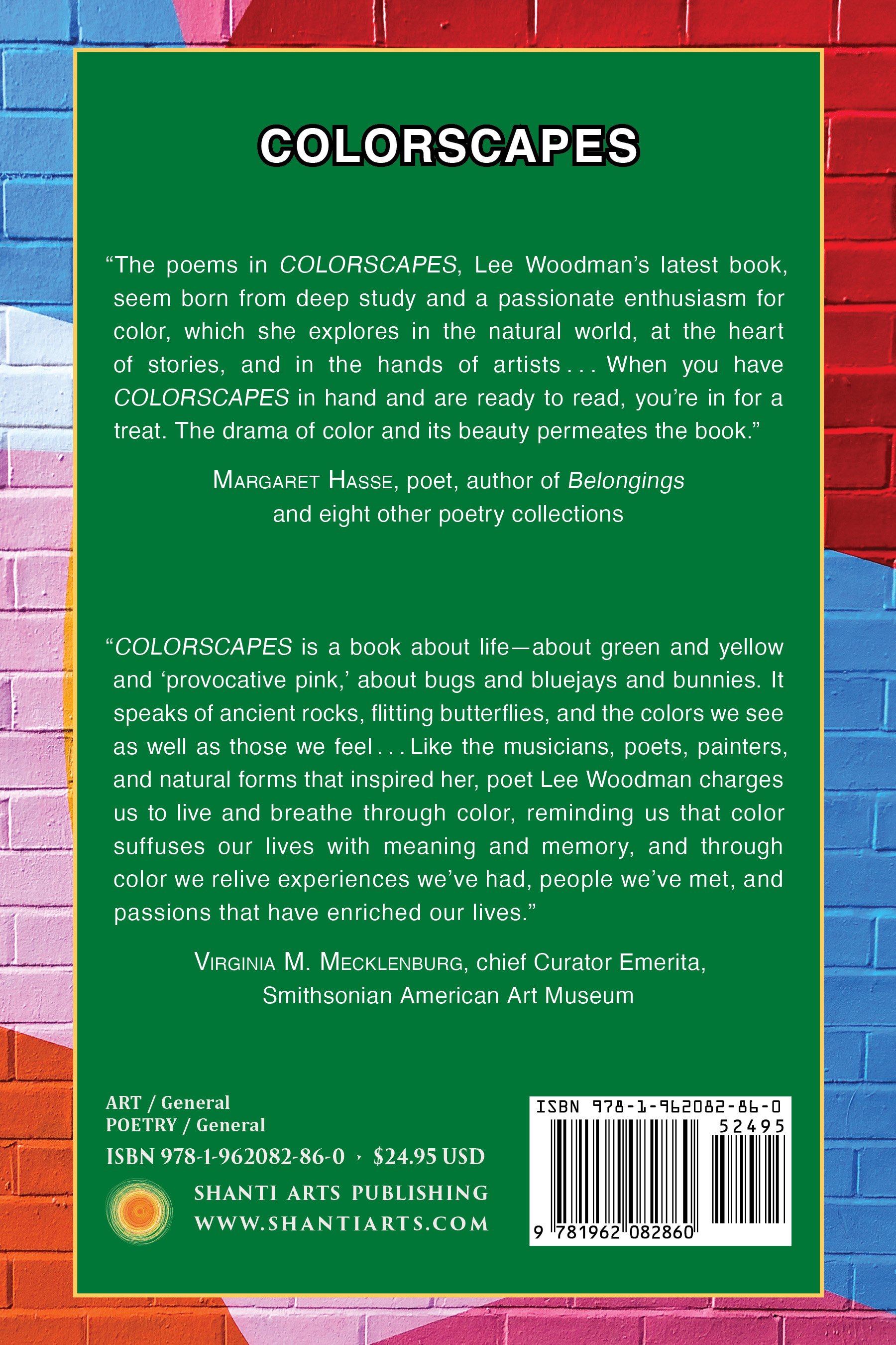 “The poems in Colorscapes, Lee Woodman’s latest book, seem born from deep study and a passionate enthusiasm for color, which she explores in the natural world, at the heart of stories, and in the hands of artists. Her images can be dazzling as a peacock’s spread tail, especially when describing birds, flowers, and gardens. Readers will enjoy, as did I, an inviting variety in poems' tone, content, and type. One witty narrative poem, “Devil with My Green Dress On,” recounts a laugh-out-loud incident featuring an emerald green velvet gown worn by a usurper. Many of Woodman’s poems offer not only fancy but fascinating fact, such as that Tyrian purple dye used in ancient Greece ‘came from milked sea snails.’ Among my favorite poems are the ekphrastic ones that respond to art and artists such as Leibovitz, Bonnard, and Vermeer. In ‘Caravaggio, a Story in Tenebroso’ the painter ‘confesses / through drama of color, he’s / John himself in fiery shroud.’ When you have Colorscapes in hand and are ready to read, you’re in for a treat. The drama of color and its beauty suffuses the book.” “Colorscapes is a book about life—about green and yellow and ‘provocative pink,’ about bugs and bluejays and bunnies. It speaks of ancient rocks, flitting butterflies, and the colors we see as well as those we feel. Lee Woodman’s poems blend sound with color in cadenced, syncopated rhythms that are primal and instinctual, fresh and new. Like the musicians, poets, painters, and natural forms that inspired her, Woodman charges us to live and breathe through color, reminding us that color suffuses our lives with meaning and memory, and through color we relive experiences we’ve had, people we’ve met, and passions that have enriched our lives.” “Lee welcomes us into her dining room like a cordial spy. But if you listen closely, you'll hear an inner roar. I trust her more than the New York Times.” |